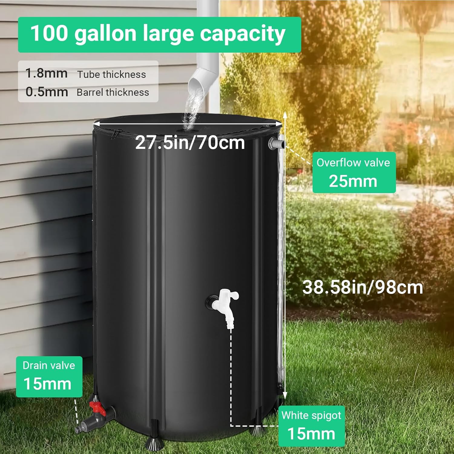 | Included Components | rain barrel with hose, accessory kit |