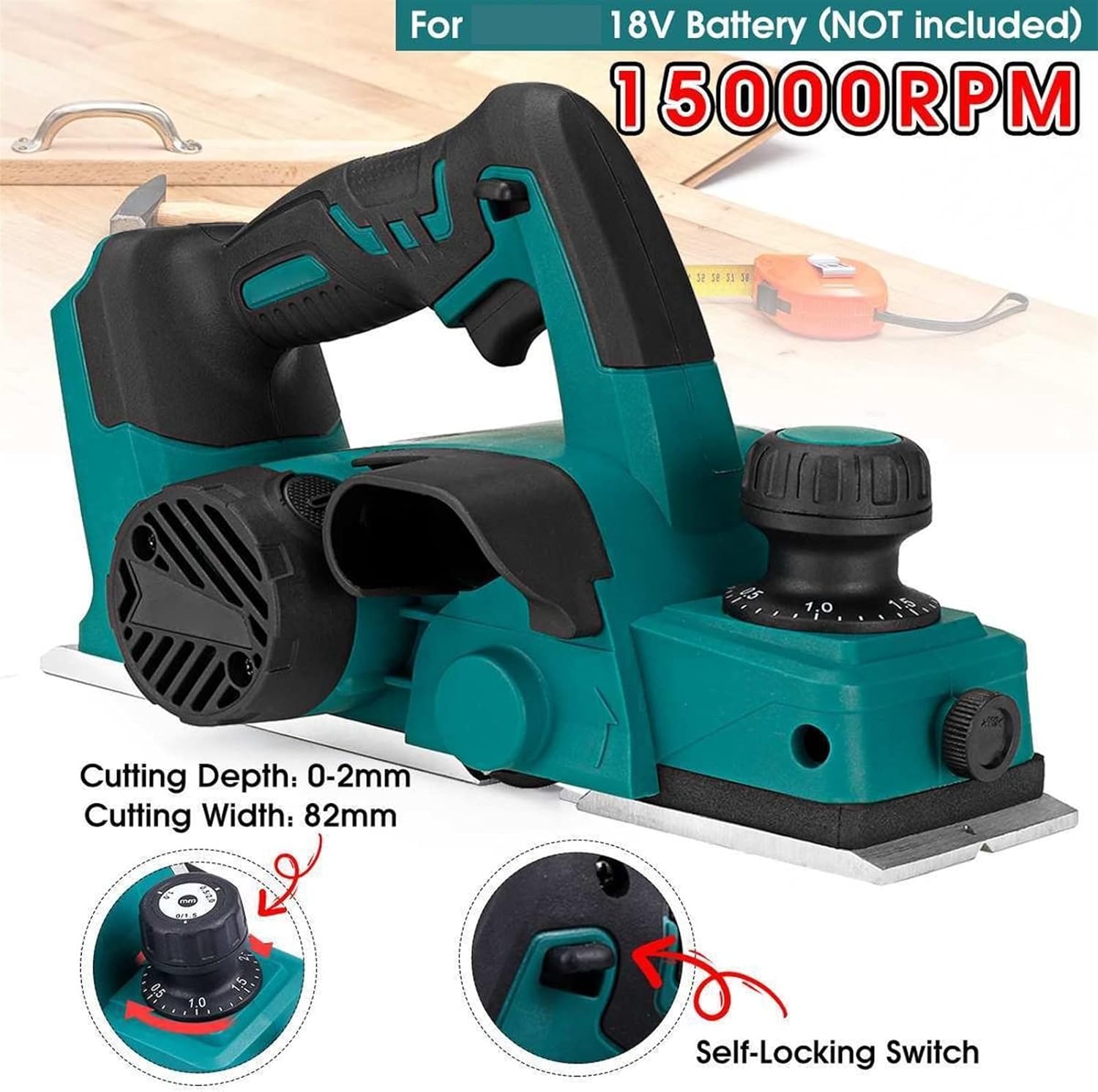 For -18V Battery Rechargeable Electric Planer Woodworking Cutting Machine (Not including battery)Specifications:Name: Electric PlanerMaterial: AlloyColor: BlueCutting Depth: 0-2mm (Max)Cutting Width: 82mmPower Supply: for -18V Battery(NOT included)Features:- Widely used, suitable for cutting solid wood etc.- 0-2mm cut depth for manual adjustment.- Aluminum bottom plate, V-shaped guide groove design.- Large-caliber chip removal design to smooth debris without obstruction,to ensure the life of the machine efficiently.- The soft rubber handle provides comfortable operation and better control, and minimizes hand fatigue.- The manual control switch and lock button can ensure safe use.- Can be used for mechanical installation is a good helper for shelf workers.Compatible Batteries:Compatible with 18V B series lithium battery, such as BL1850B (197285-8), BL1840B (197270-1), BL1830B (197602-2), BL1430B (197618-7), BL1820B (197487-6);Compatible with BL1850, BL1840, BL1440 (196391-6), BL1415 (194560-3), BL1815N(196781-3);× NOT compatible with G series battery such as BL1813G (196663-9), BL1413G (196882-7), BL1415G, BL1430G, BL1815G and so on.× NOT compatible with 18V Ni-CD battery such as 1822 (194465-7).Package Included:1 x Electric Planer (Battery isNOTincluded.)1 Set of WrenchLightweight electric planer for efficient and smooth woodworking surfaces. Adjustable depth, comfortable handle. Ideal for finishing, making furniture and other woodworking projects. Portable and easy to use, fine planing.