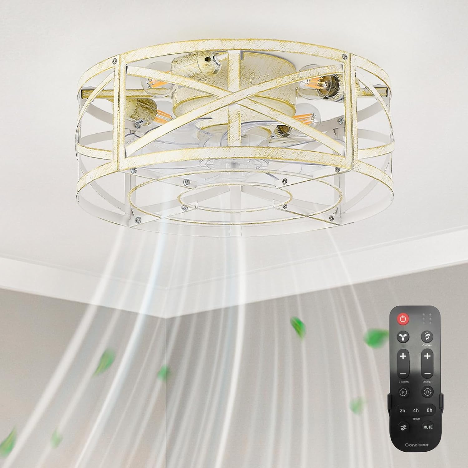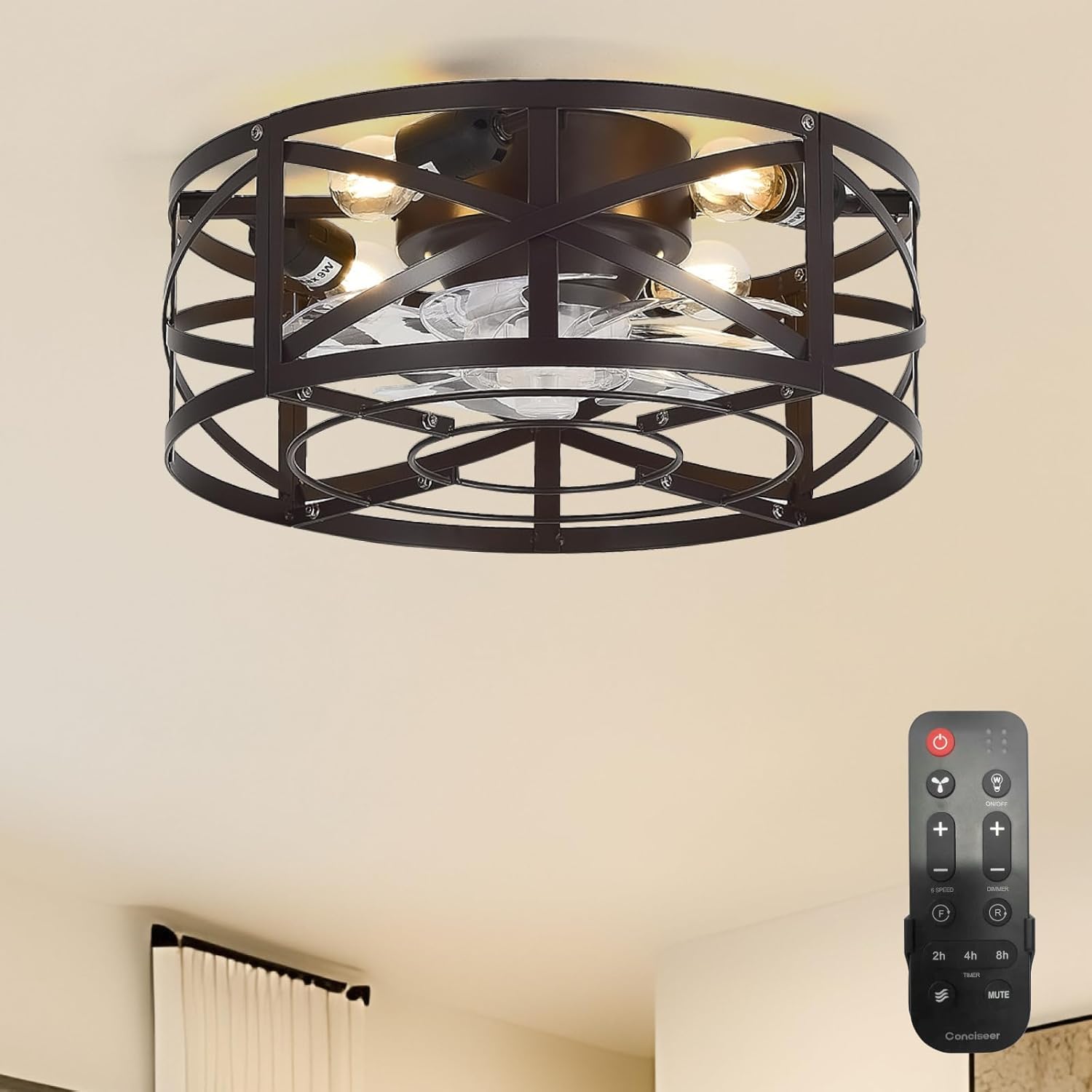 20 Inch Caged Ceiling Fans with Lights and Remote, Flush Mount, Low Profile 7 Blades, 6 Speed Reversible Quiet DC Motor for Bedroom, Kitchen and Living Room, Black