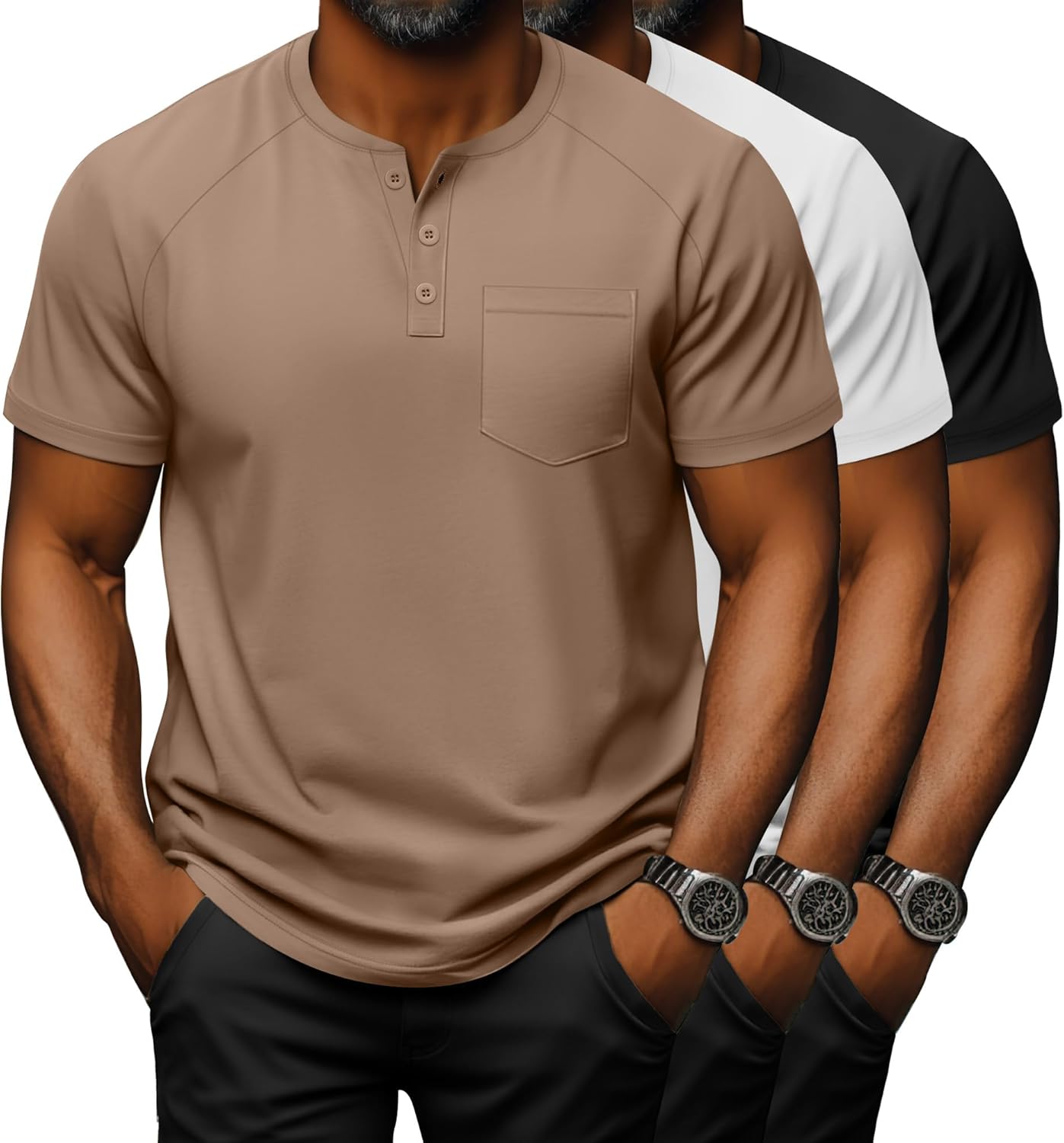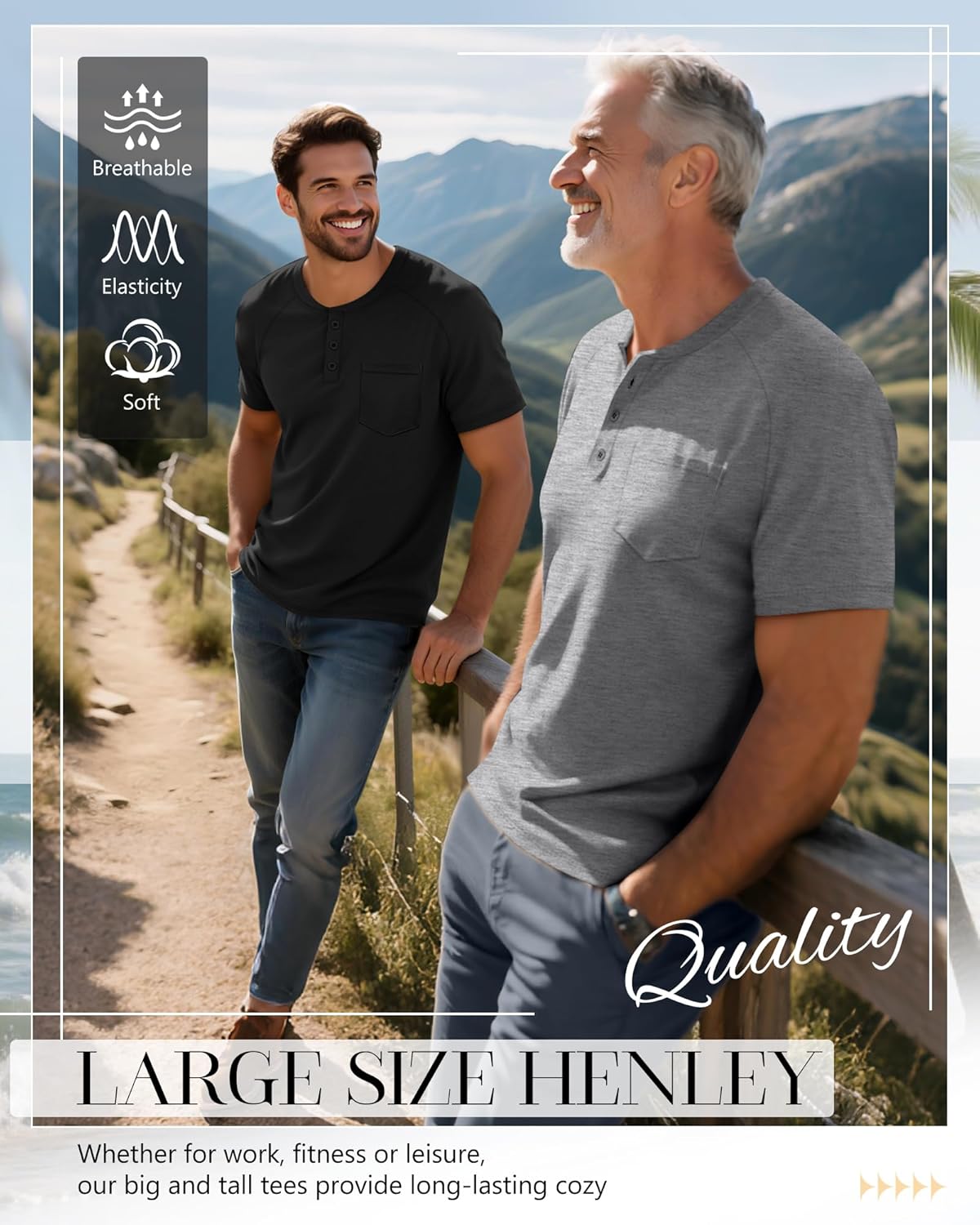 Features: Size selection: Please check our size chart before you place order for comfortable wearing. Clothing maintenance: Machine washable or hand wash with cold water. Do not bleach / Lay flat to dry / Do not iron at high temperature. Material: 65% Polyester, 30% Cotton, 5% Spandex Package includes: 3 x Men's big and tall raglan short sleeve henley T-shirts Notes: Manual measurement, please allow slight errors on size. The color may exist a slight difference due to different screen displays