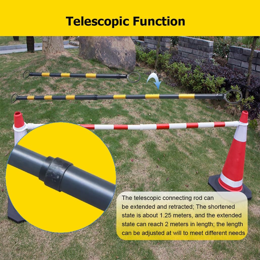 These traffic cone bar are made of flexible industrial plastic PVC materials; They are sturdy, cold-resistant, heat-resistant, waterproof, & can be used in adverse weather conditions without severe wear and tear;The telescopic design enhances their practicality and portability, saving space when not in useSpecifications:Material: PVC Industrial PlasticColor: Red and White, Blue and White, Green and White, Yellow and White, Yellow and Black Size: 4.1 ft to 6.56 ftFeatures:1. The retractable design of the traffic cone bar is easy to carry & store2. The cone bars has reflective function with very eye-catching colors3. The reflective cone bar is made of PVC material, cold and frost resistant, not easy to agingPackage Includ:6 x Retractable traffic cone bars (Exclude road cones)Please Note:1. Manual measurement, please allow slight errors on size.2. The color may exist a slight difference due to different screen displays.