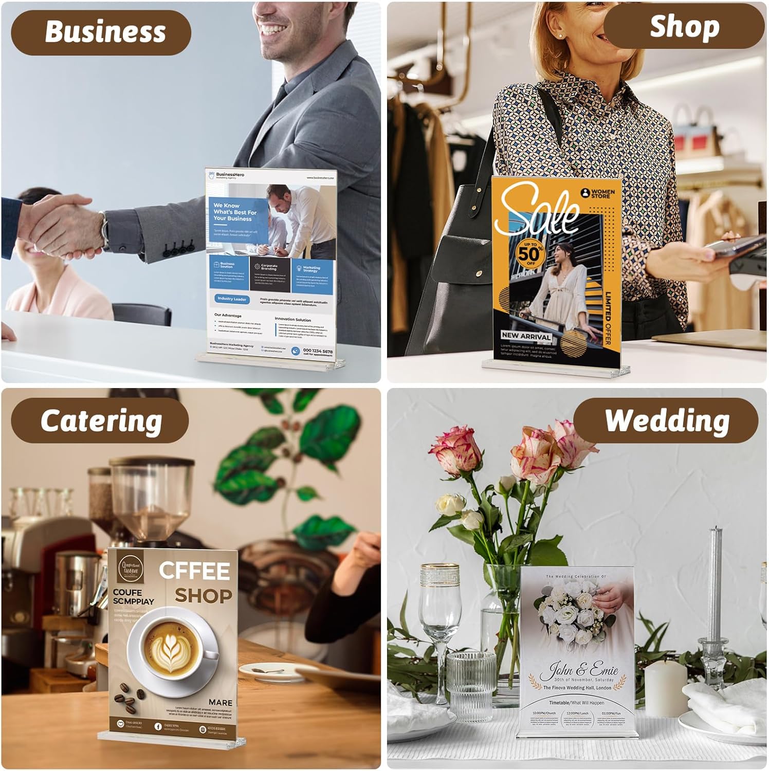 The A4 poster stand is ideal for showcasing brochures, price lists, menus, leaflets, cards, documents and children's artwork in shopping malls, hotels, stores, restaurants, schools, churches, trade shows, reception areas, weddings and conference centers, making it easy for customers to access information. This A4 acrylic sign holder can accommodate brand logos or materials to enhance brand visibility and highlight retail, advertising, and new product information to capture customer attention. Plastic display stands Ideal for showcasing important information on reception table, conference tables, or dining tables while keeping spaces tidy. The side-opening design allows for quick content changes, a4 sign holder stand protecting the advertisement from tearing, stains while accommodating various needs. This A4 plastic stands display holder is both practical and aesthetically pleasing, suitable for various commercial and office settings.