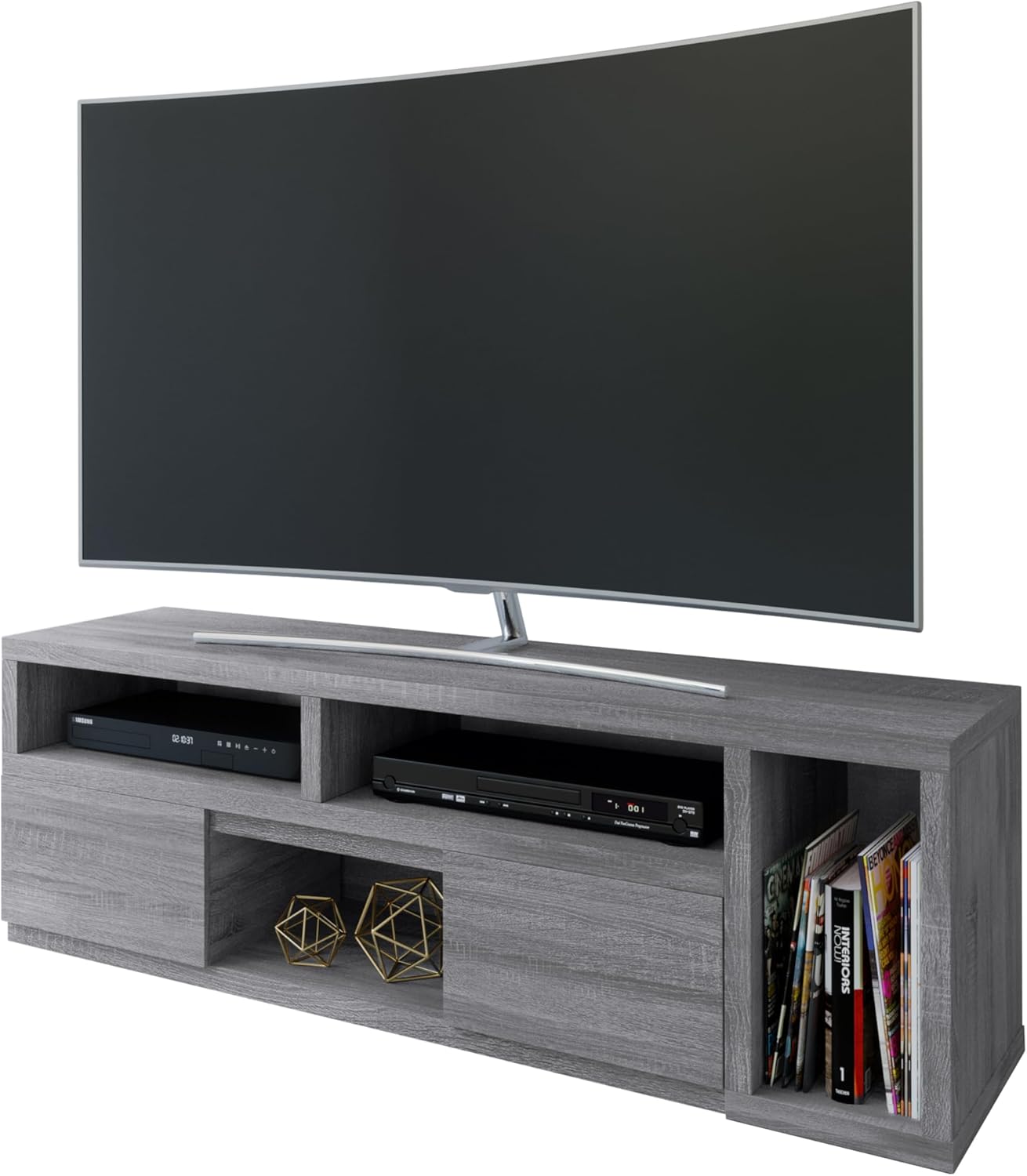Techni Mobili Expandable TV Stand will enhance your entertainment area with this asymmetrical inspired piece of art. Finished in calming grey, this 53.5" expandable TV stand is the perfect blend of style and functionality. Easily slides open to a full length of 82.5", this piece is uniquely yours to design to accommodate your needs within your entertainment space. With two large storage drawers and four shelves to keep your media items organized and clutter free, the versatility of this piece make this a must have in any home. Color: Grey