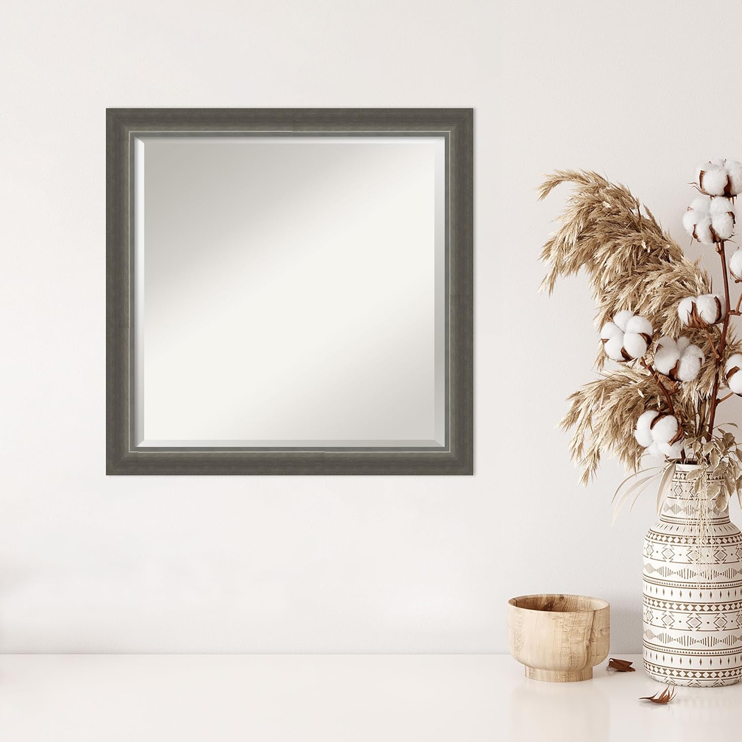 PRODUCT: Amanti Art Beveled Wood Wall Mirror; OUTER SIZE: Exactly 23 x 23 inches; FRAME: Domus Dark Silver; FRAME FINISH: Brushed Nickel; FRAME COLOR: Silver. The Domus Dark Silver frame is a silver frame with brushed, dark silver highlights on inner and outer edges. Frame angles down from the outer edge and has a distinct inner lip. Give your home or office the finishing touch with this 100% real wood-framed wall mirror. Individually made using traditional custom framing techniques, it has the quality you would expect from your local frame shop. It holds its value with premium finishing that can be appreciated up close. Because of our attention to detail and focus on artistry, architects, interior designers, and homeowners alike choose this mirror to create beautiful living spaces.