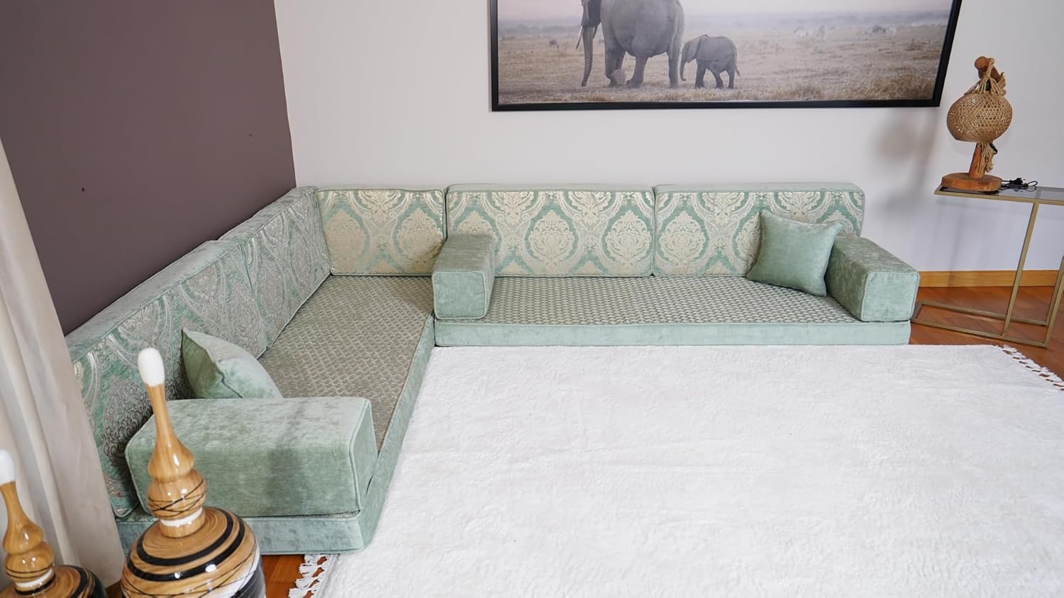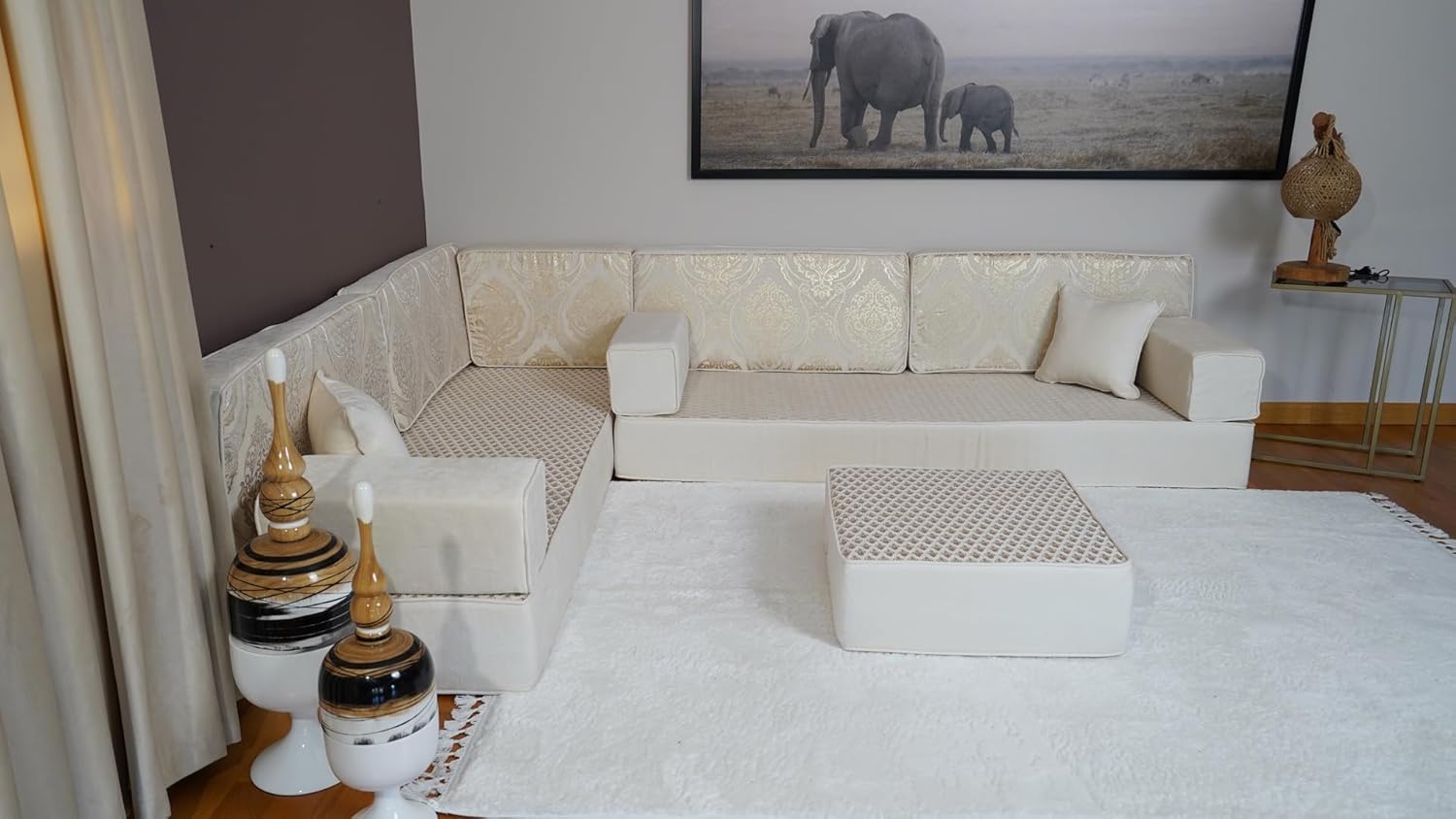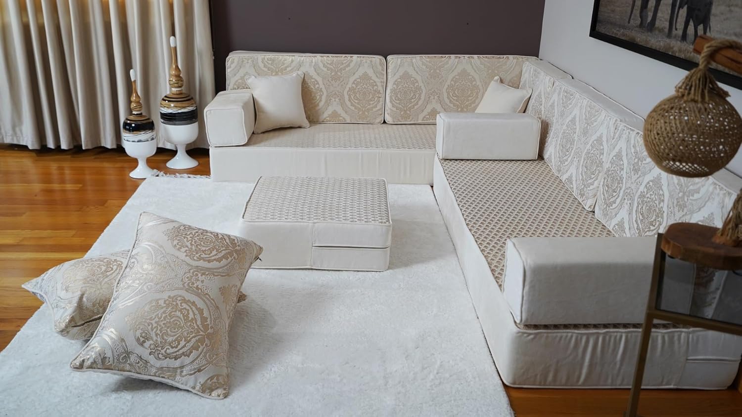 You will receive products in the variant you selected from the listing page. This sofa set comes in 16 separate pieces. If you choose 'L Sofa + Ottoman + Pillows / 4'' Thickness Sofa’ you will get these: -2 Floor Seating Cushion (190 x 70 x 10 cm / 75'' x 27'' x 4'') -4 Backrest Pillows (95 x 40 x 10 cm / 38 x 16 x 4 inch) -1 Backrest Pillows (75 x 40 x 10 cm / 30 x 16 x 4 inch) -3 Pouf Pillows -3 Armrest Pillows (50 x 20 x 20 cm / 20'' x 8'' x 8'') -1 Ottoman Couch (60 x 60 x 20 cm / 24'' x 24'' x 8'') -2 Small Pillows (35 x 35 cm / 14 x 14 inch) * The floor sofas are not freestanding, they need to lean against a wall or something hard behind * We can customize this product upon your request * All covers include their foam filling inserts * All covers are zippered * Beautiful texture and soft to touch * Comfortable to sit or sleep on * Top-quality finish and workmanship * Excellent for homes, offices, hotels, cafeterias, etc. * Machine washable