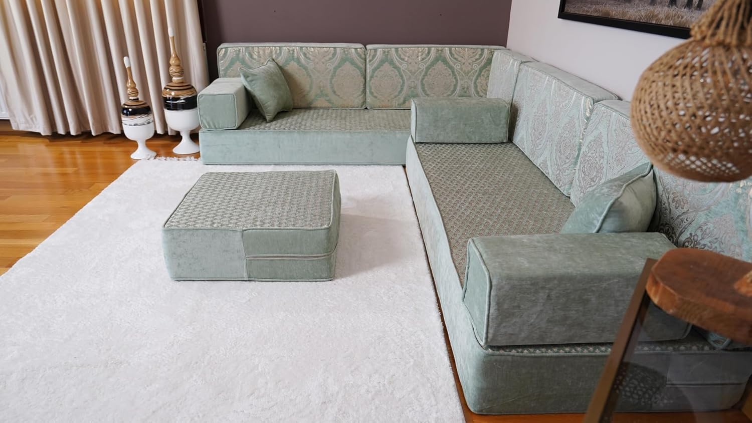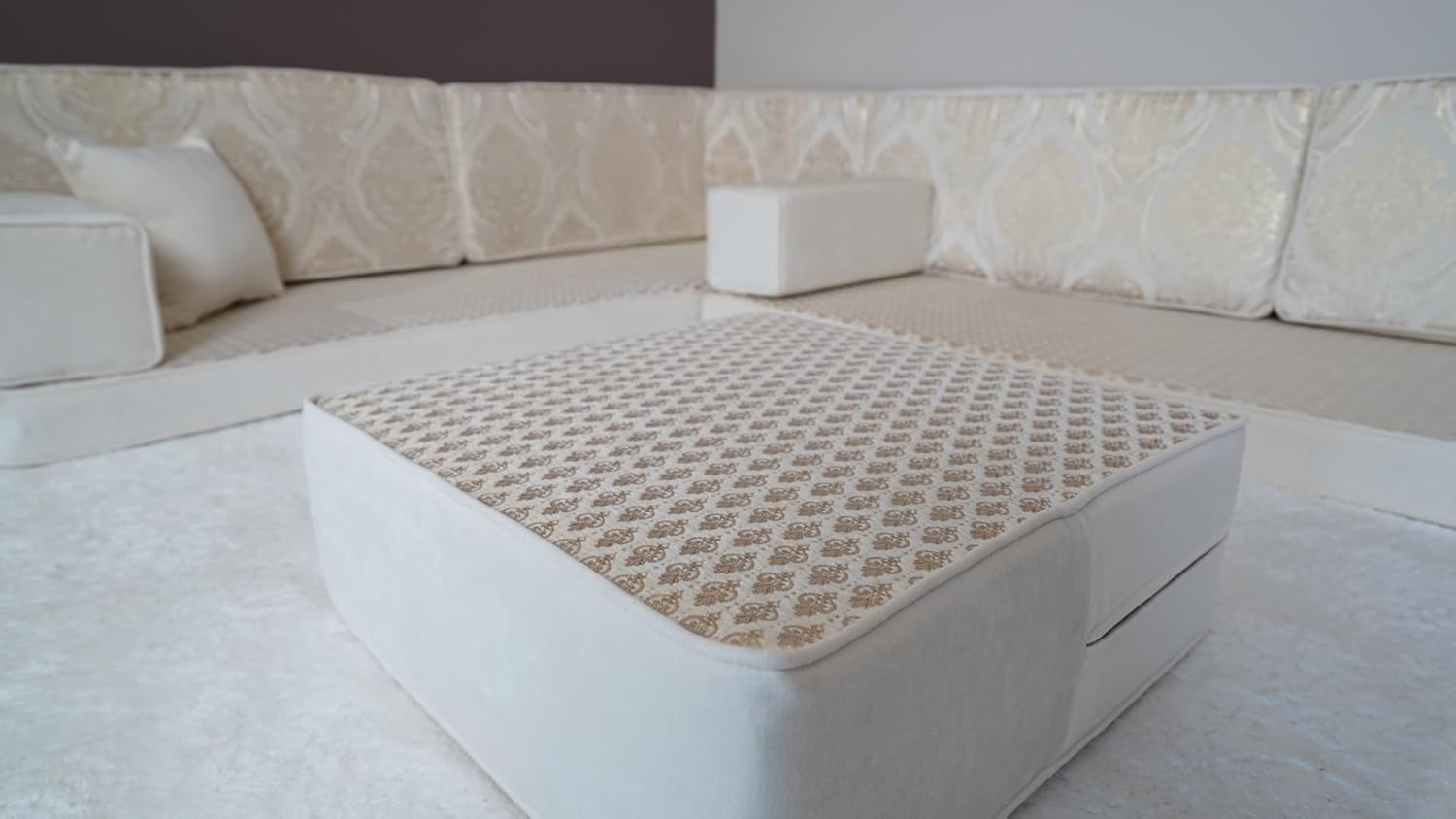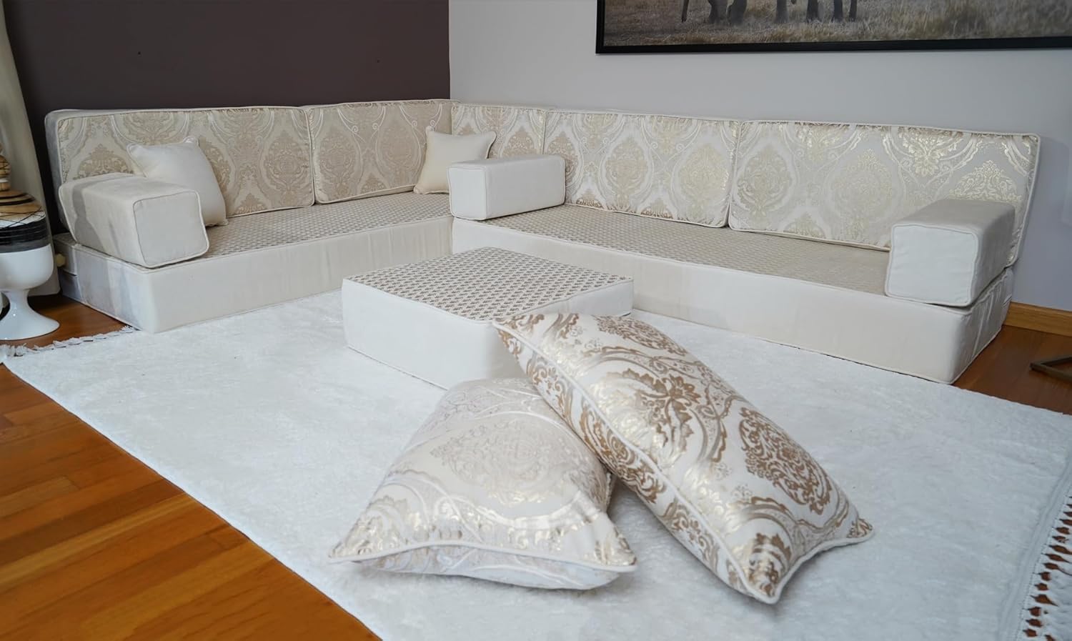 You will receive products in the variant you selected from the listing page. This sofa set comes in 16 separate pieces. If you choose 'L Sofa + Ottoman + Pillows / 4'' Thickness Sofa’ you will get these: -2 Floor Seating Cushion (190 x 70 x 10 cm / 75'' x 27'' x 4'') -4 Backrest Pillows (95 x 40 x 10 cm / 38 x 16 x 4 inch) -1 Backrest Pillows (75 x 40 x 10 cm / 30 x 16 x 4 inch) -3 Pouf Pillows -3 Armrest Pillows (50 x 20 x 20 cm / 20'' x 8'' x 8'') -1 Ottoman Couch (60 x 60 x 20 cm / 24'' x 24'' x 8'') -2 Small Pillows (35 x 35 cm / 14 x 14 inch) * The floor sofas are not freestanding, they need to lean against a wall or something hard behind * We can customize this product upon your request * All covers include their foam filling inserts * All covers are zippered * Beautiful texture and soft to touch * Comfortable to sit or sleep on * Top-quality finish and workmanship * Excellent for homes, offices, hotels, cafeterias, etc. * Machine washable