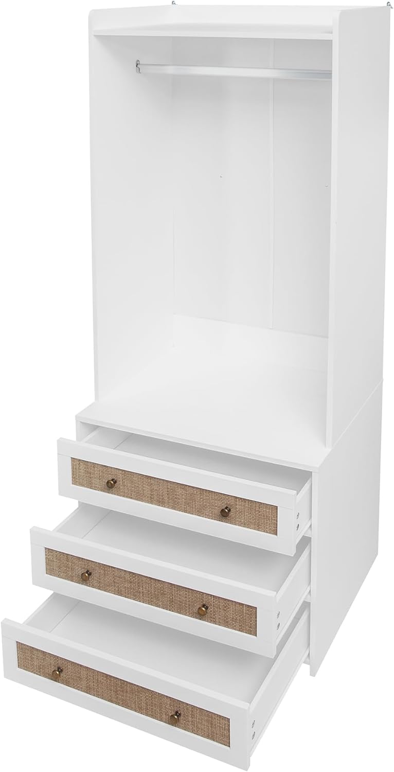 Welcome to Cloblane! We have been committed to providing customers with the most satisfactory furniture and services. ●Wardrobe Closet Features -The top section features a horizontal rod for hanging scarves, handbags, and more. Combined with the lower drawer, it offers both open and closed storage for greater flexibility. -The drawer front is made of engineered rattan, mimicking natural elements with no color variation or burrs. It provides a smooth, delicate touch while ensuring durability. -The minimalist white design blends effortlessly into various home settings, including the living room, bedroom, and study, complementing different interior styles. -Equipped with an anti-tip device to minimize the risk of tipping, ensuring a safer environment—ideal for homes with children and elderly family members. -Designed with protective foot pads to prevent floor scratches while enhancing stability, prolonging the lifespan of both the furniture and flooring. -All pieces are well labled, it woul be clear to assemble, you'll not get stuck with the assembly. ●Specifications Overall Product Dimension: 27.6"L x 18.9"W x 71"H Overall Product Weight: 84.87lbs Detail Product Dimension: Please refer to the size image Product Type: Wardrobe Color: White Material: Particle Board+MDF Number of Drawers: 3 Number of Package: 1 Assembly Required: Yes ●Notice -Manual measurement has been used, there may be some reasonable error. -All the pictures are taken by actual samples, slight chromatic aberration may occur due to lighting or display. If you have any questions, suggestions or problems, please contact us. We will provide you with the best solution. Thank you for your support! Enjoy your shopping time!