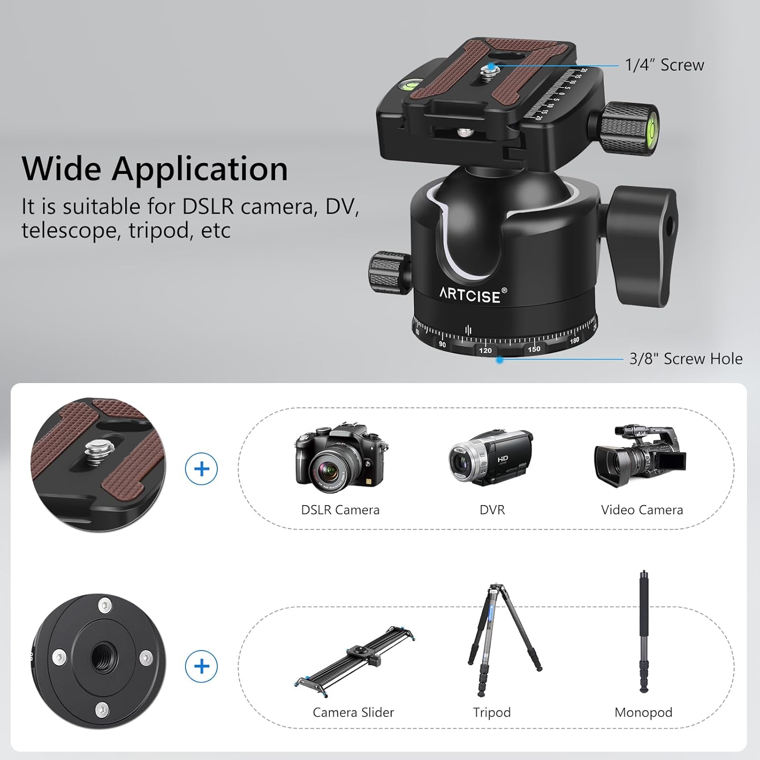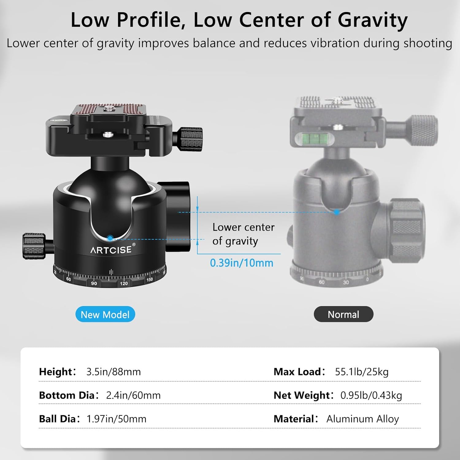Stable Performance with Low Center Gravity DesignThis black 50mm low center gravity ball head is designed to provide improved balance and stability for professional photography. The low-profile structure helps reduce vibration and keeps your camera securely positioned.Large 50mm Ball for Strong SupportThe oversized hollow ball delivers high load capacity and reliable holding power while maintaining smooth, controlled movement for precise adjustments.Precision CNC Aluminum ConstructionCrafted from high-quality aluminum alloy using full CNC machining, this ball head offers excellent durability, accurate tolerances, and a refined matte black finish.Smooth and Accurate ControlIndependent control knobs allow precise locking and fluid operation, making it easy to fine-tune your composition during shooting.Effortless Vertical ShootingThe built-in U-shaped groove enables quick switching to portrait orientation, supporting both photography and video recording.Lightweight Yet ReliableHollow ball design and skeletonized Arca-Swiss clamp reduce unnecessary weight, making this ball head easy to carry for travel and outdoor use.Wide Compatibility and Practical AccessoriesThe standard Arca-Swiss quick release system with a 1/4" camera screw fits most DSLR and mirrorless cameras. A 3/8" bottom thread ensures compatibility with tripods and monopods. The built-in bubble level helps fast leveling, while the included extra quick release plate and 1/4"-3/8" adapter screws simplify multi-device switching.