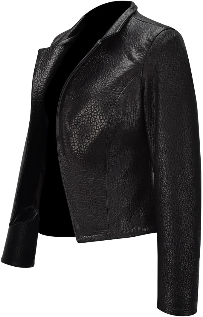 Jacket for women in ovine leather. It presents padded applications in contrasting color, metallic applications and handwoven details. With application in contrasting texture in the front and mao collar. Without adjustment, it is an open jacket. It does not have pockets.