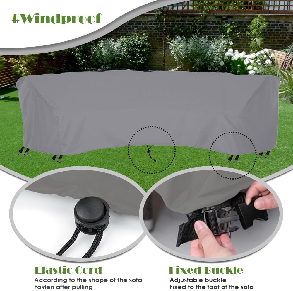 Size Option: 90x45.5x34in(228x116x86cm) 120x39x36in(305x99x91cm) 190x39x36in(483x99x92cm) Available in 3 sizes, suitable for most curved sofas in the market. Please measure your furniture first to determine the proper cover size. Made of heavy-duty 420D Oxford fabric that can support weather-resistant, water-resistant fade Resistance, and rip-resistant. With an added UV-stabilized coating, delay the aging caused by UV rays and prolong the service life the cover builds to last through all seasons. The cover is designed to protect your outdoor furniture from UV ray, bird droppings, tree sap,dirt, dust, rain, snow, small animals and extreme temperatures. With drawstrings design on the cover bottom to secure cover on the windiest days, There are two additional buckles at the bottom, which can be fixed on the sofa leg, added security to make it won't blow away in the wind. Easy to clean, you can hose it down with water and let it dry in the sun. Comes with storage bag.