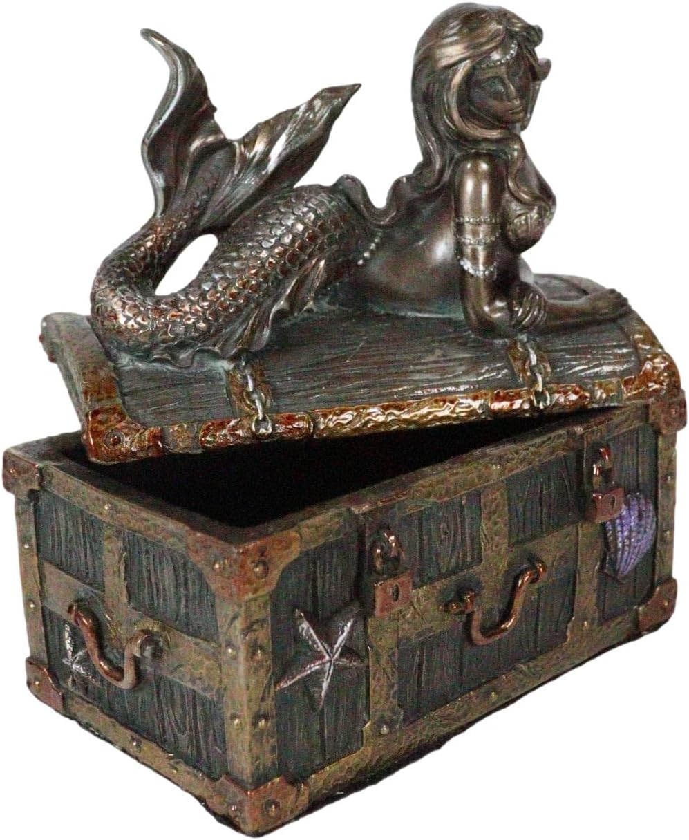 This beautiful mermaid jewelry box is made of polyresin, hand painted and polished. This beautiful mermaid jewelry box measures approximately 5.75" high and 5.25" long and 3 1/8" deep. The interior box dimensions are 1 7/8" Deep 2.25" Wide 4.5" Long approximately. This beautiful mermaid Nerida Rests Her Belly on top of a Sunken treasure chest decorated with starfishes and seashells. This treasure chest is her lifelong collection of human possession lost to the seas as she yearns a life out of the waters. This rectangular mermaid box is very useful to keep jewelry, coins, watches, knick knacks and other items to your fancy! It is a personal sized box, making it a very lovely gift for anyone close to your heart.