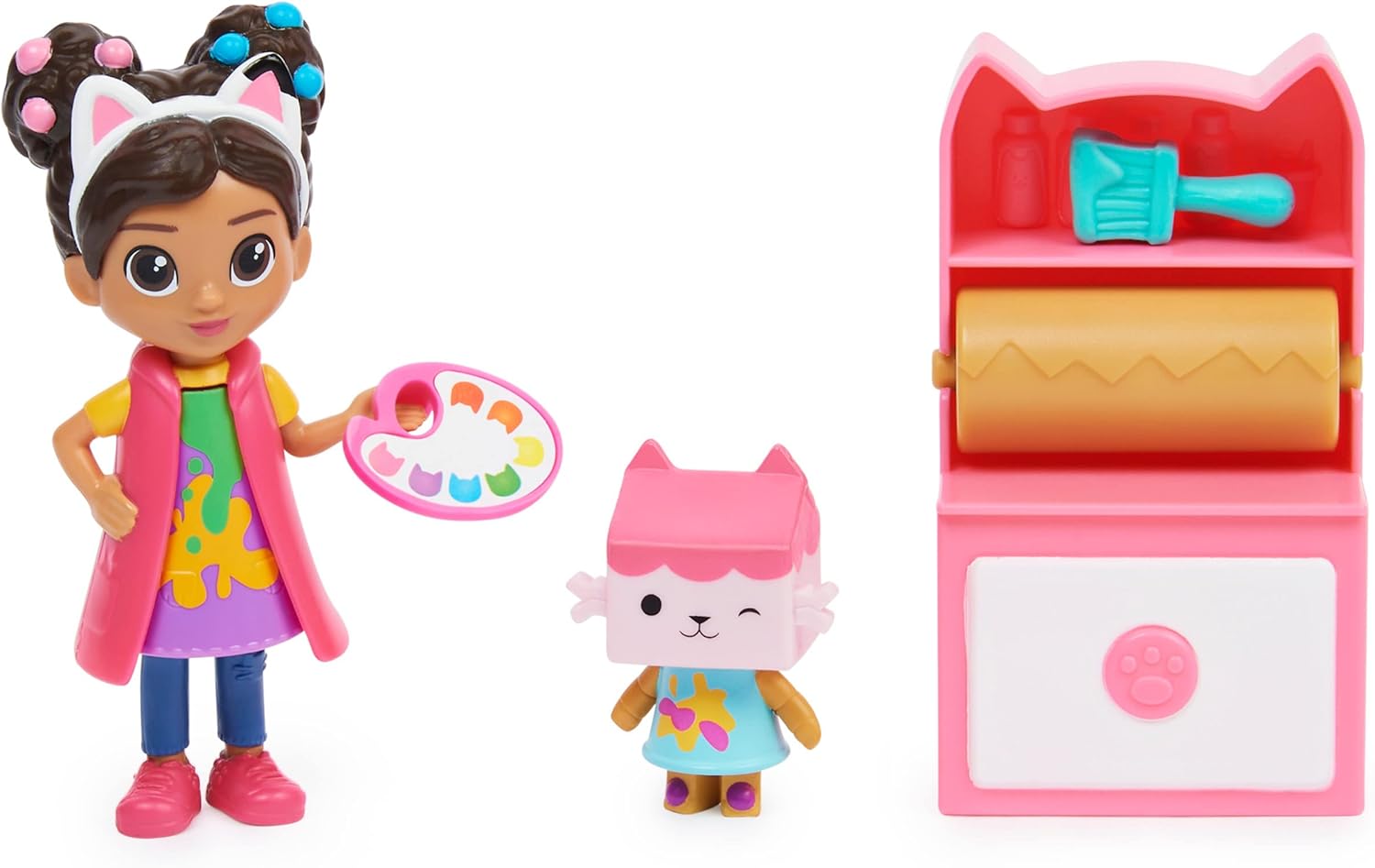 Paint a masterpiece with Gabby and the Art Studio Set by Gabby's Dollhouse. This fun toy set includes a collectible 3.8-inch Gabby Girl figure, Baby Box Cat figure, a craft cabinet, a paint palette, and a surprise box with a hidden accessory inside. Just like Gabby does on the show, open the delivery of the special surprise box and discover the mysterious accessory of the set. What will you find inside? After figuring out what the surprise is, use your imagination to create your own adventures with Gabby and Baby Box Cat. Place the palette or surprise accessory in Gabby's hand and help her use her creativity in the studio. Press Gabby's cat ears and watch her robe change from clean to paint splashed. Press the cat ears again to clean the robe. You'll see how funny. Then, make it as if you pulled craft paper out of the cabinet roller, which really spins. This toy for boys and girls makes the perfect gift and can be used with the Gabby's Purrfect Dollhouse (sold separately). Discover more storytelling possibilities with all Gabby's Dollhouse Sets, including the Flower-rific Garden and Kitty Karaoke (sold separately). To receive one last surprise, scan the QR code inside the surprise box to unlock a special prize in the free Gabby's Dollhouse app (available on iOS and Android). Take home the Art Studio Set and join Gabby from Gabby's Dollhouse for painting fun.