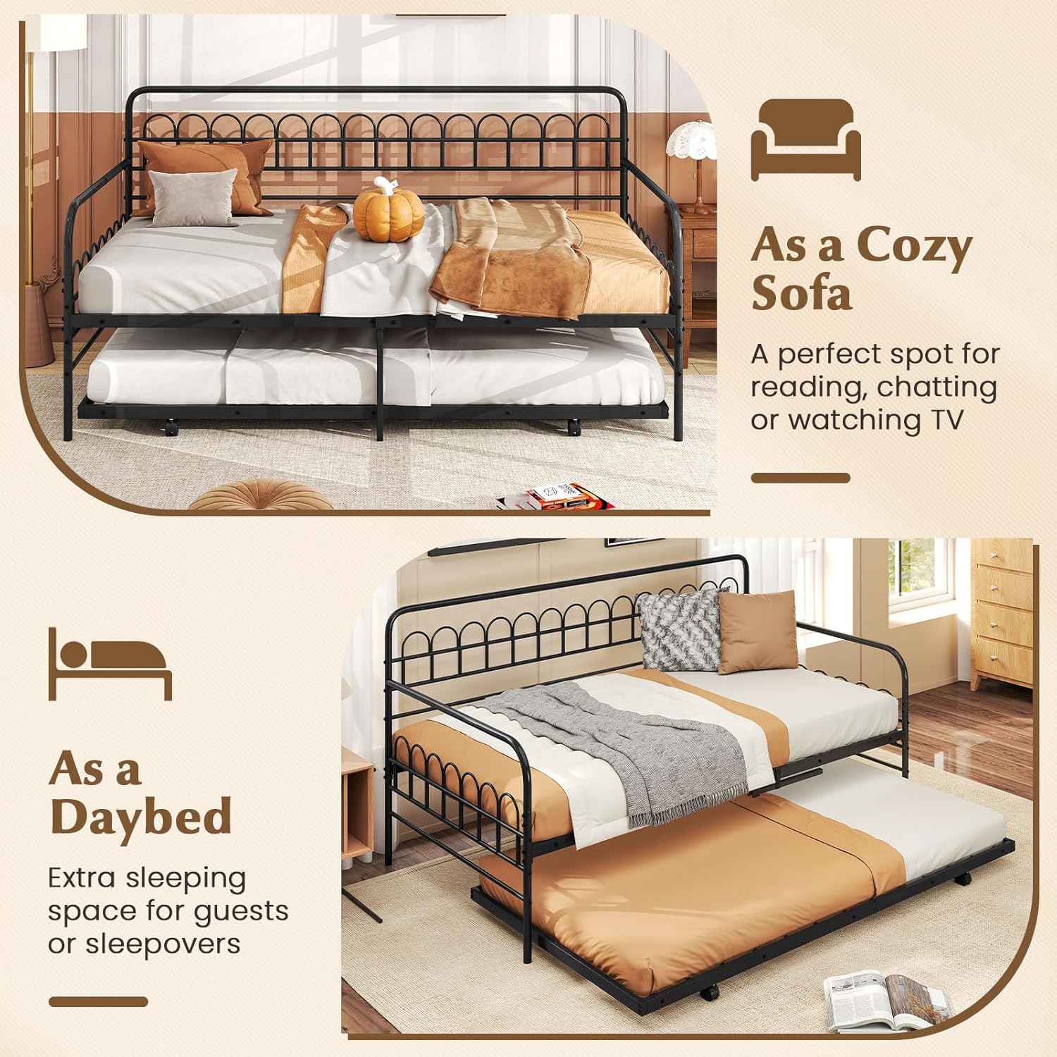 Description:Enhance your living space with this twin daybed with trundle!This twin daybed is not just a practical sleeping solution but also doubles as a stylish sofa for your daytime needs. For added convenience, the sofa bed features a space-saving trundle that is perfect for accommodating overnight guests. The lockable wheels and foldable middle metal leg make it easy to push in and pull out. Crafted with heavy-duty metal slats, this sofa bed boasts robust support and durability. Besides, the curved arch backrest and armrests offer a unique aesthetic appeal that blends well with various home styles. All in all, this modern sofa bed is a practical addition to living room, guest room, or bedroom.Features:As a cozy sofa, a perfect spot for reading, chatting or watching TV As a daybed, extra sleeping space for guests or sleepovers Twin metal daybed with trundle is ideal for limited spaceSpace-saving pull-out trundle enlarges sleeping spaceSupported by 13 + 13 heavy-duty metal slats for rugged structureEquipped with additional support leg for higher stability Hook and loop fastener for fixing the leg4 lockable casters for easy movement & sturdily stopRounded arch detailing on 3 sides enhances aesthetic appealCompatible with twin size mattress and no box spring neededIdeal for living room, bedroom, and guest room, etcAssembly needSpecifications:Color: Black/GoldMaterial: MetalOverall Dimensions: 76.5" x 41" x 40" (L x W x H)Dimensions of Trundle: 73" x 40" x 4" (L x W x H)Sofa Bed Surface: 75" x 40.5" (L x W)Height of Armrests: 29"Net Weight: 55 lbsWeight Capacity of Sofa: 440 lbsWeight Capacity of Trundle: 330 lbsRecommended Mattress Thickness: 3"-5"1 x Daybed with Trundle1 x User Guide
