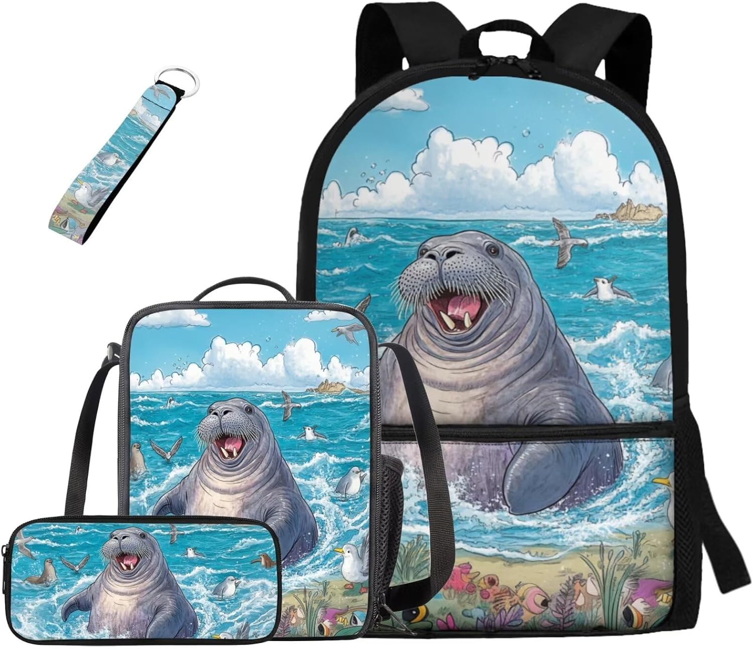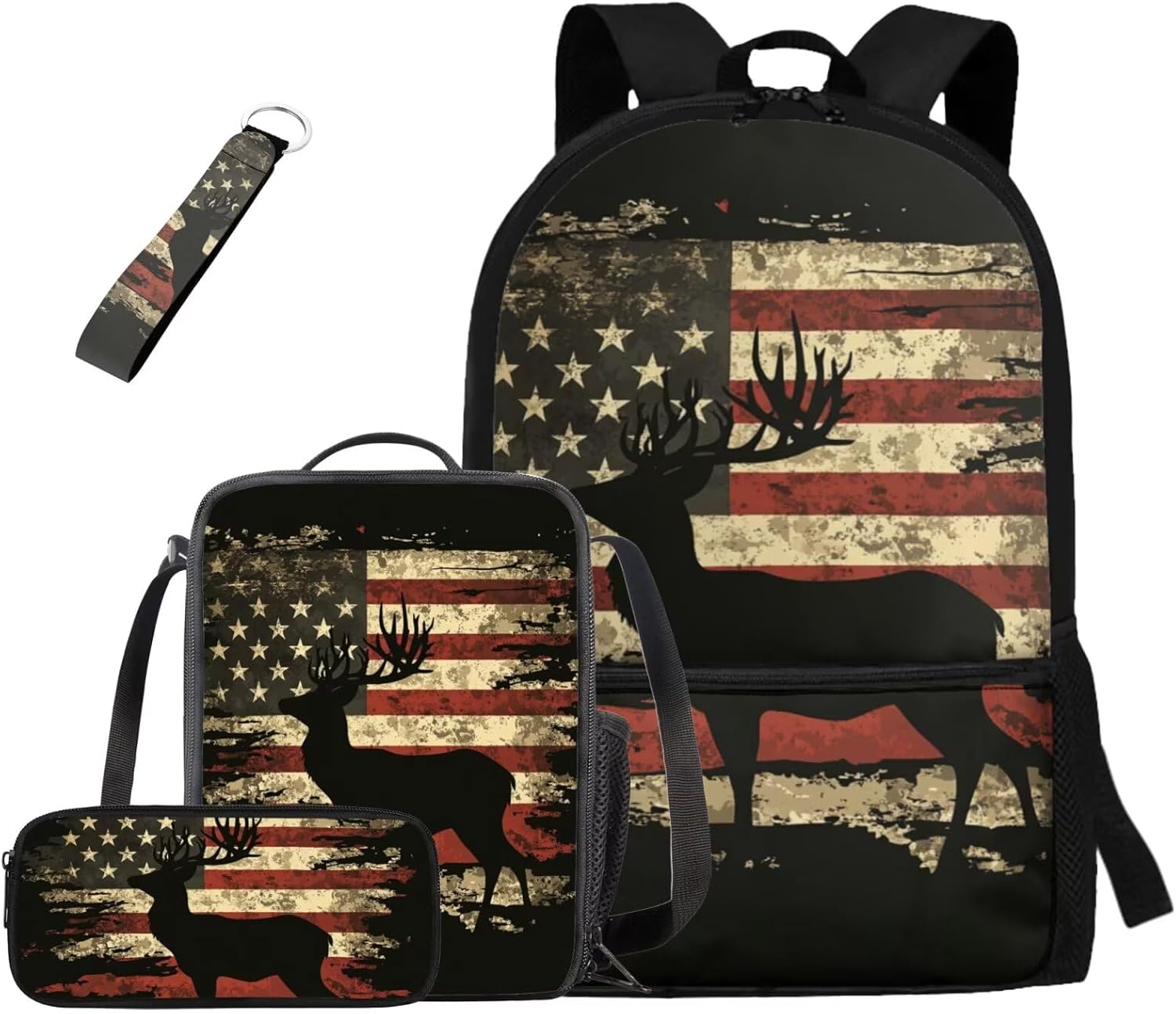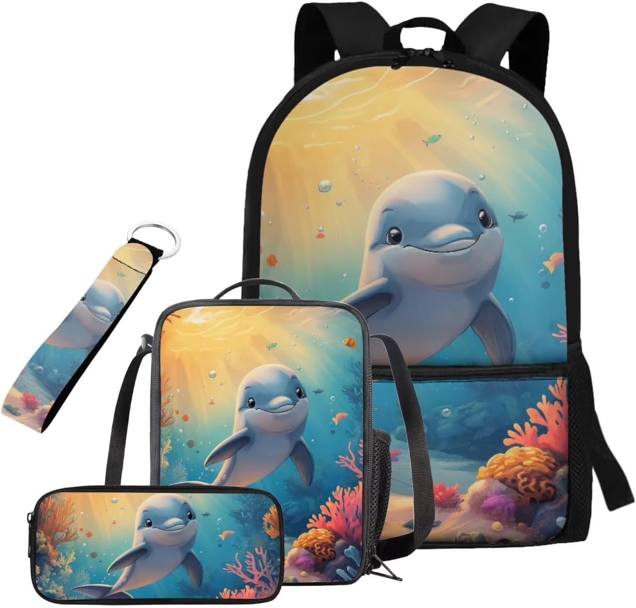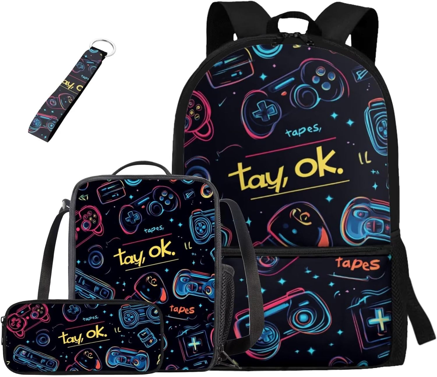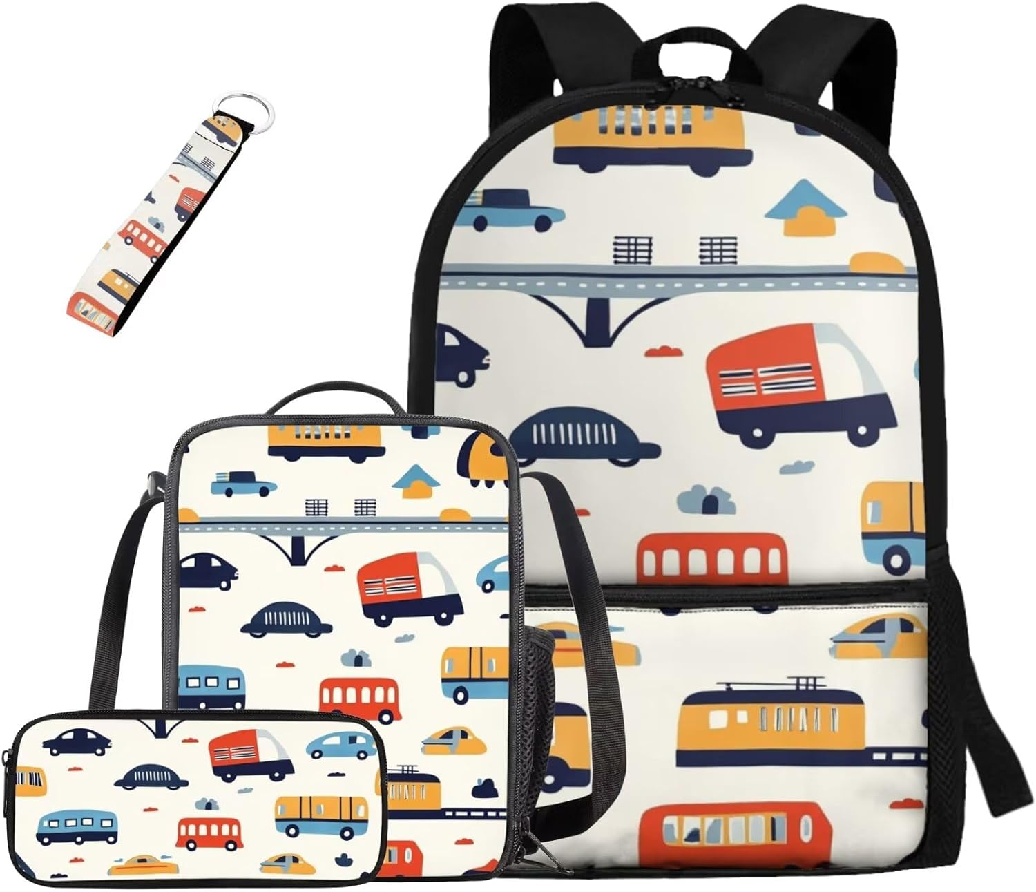 Kids Backpack Set Introducing our premium Kids Backpack Set, This thoughtfully designed four-piece set features a durable 17-inch student backpack made from high-quality polyester material known for its softness, durability, and resistance to fading. With its stylish, lightweight, and ergonomic design, this backpack effortlessly combines fashion with practicality Optimal Comfort: Designed with adjustable shoulder straps that align with ergonomic principles, our backpack provides superior comfort, relieving shoulder strain even when carrying heavy items Spacious Capacity: The backpack boasts a large compartment, perfect for organizing and easily storing a laptop, iPad, books, clothes, pencil case, crayons, and more. It also features two side pockets for water bottles or umbrellas, enhancing its convenience Lunch Bag & Pencil Case: The included lunch bag is crafted from the same soft, high-quality polyester as the backpack, with an EVA + PE cotton lining that ensures easy cleaning in case of spills. Featuring dual zippers and an internal mesh pocket, it conveniently holds utensils. The pencil case is simple yet spacious, with a single zippered compartment that’s easy to access Stylish Keychain: Our set is completed with a durable ribbon-style keychain that can easily attach to backpacks, keys, wallets, and cosmetic bags. The smooth finish and clear, aesthetic stitching make it a delightful addition to any accessory collection Perfect For: This Kids Backpack Set is suitable for various occasions, including school, work, business trips, travel, sports, summer camps, and picnics. It makes for a thoughtful gift for birthdays, or any special occasion for friends, family, or children Whether buying for your child or as a gift for someone special, the Kids Backpack Set is not just a practical item but a stylish expression of personality and love. Don’t miss out on this must-have fashionable piece order yours today