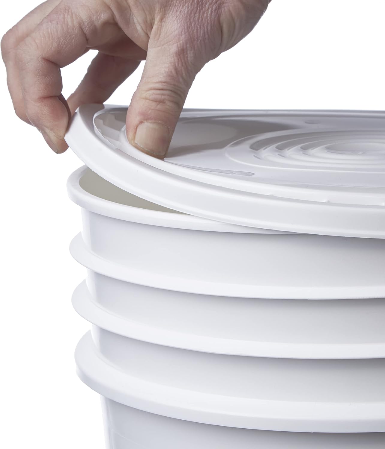These 5 gallon HDPE buckets are extremely tough. 90 mil construction allows for these buckets to be used over and over again. Sturdy wire bail with a plastic handgrip is attached to the bucket. Practical Fill is 5.10 gal. (19.30 liters) and overflow fill is 5.40 gal. (20.44 liters). Meets FDA standards. Hot fill capability up to 190°F with appropriate materials and freezer compatible. Package contains 1 red bucket, 1 white bucket, 1 blue bucket, and 3 white lids.