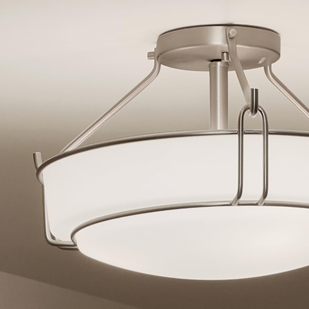 The Alkire 16.5" 3 light semi flush features a modern classic look with its Brushed Nickel finish and satin etched white glass. The Alkire is perfect in a transitional and modern environment.