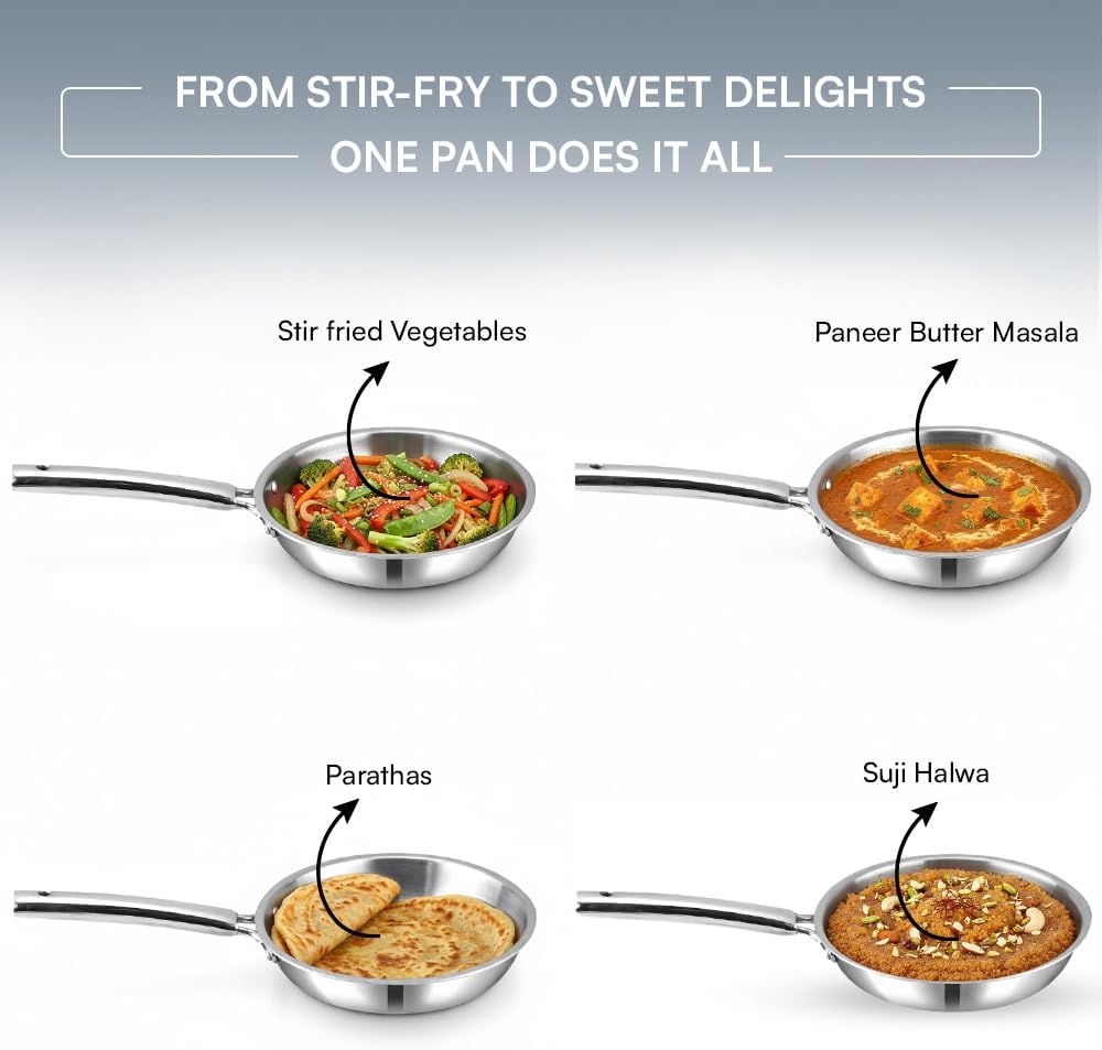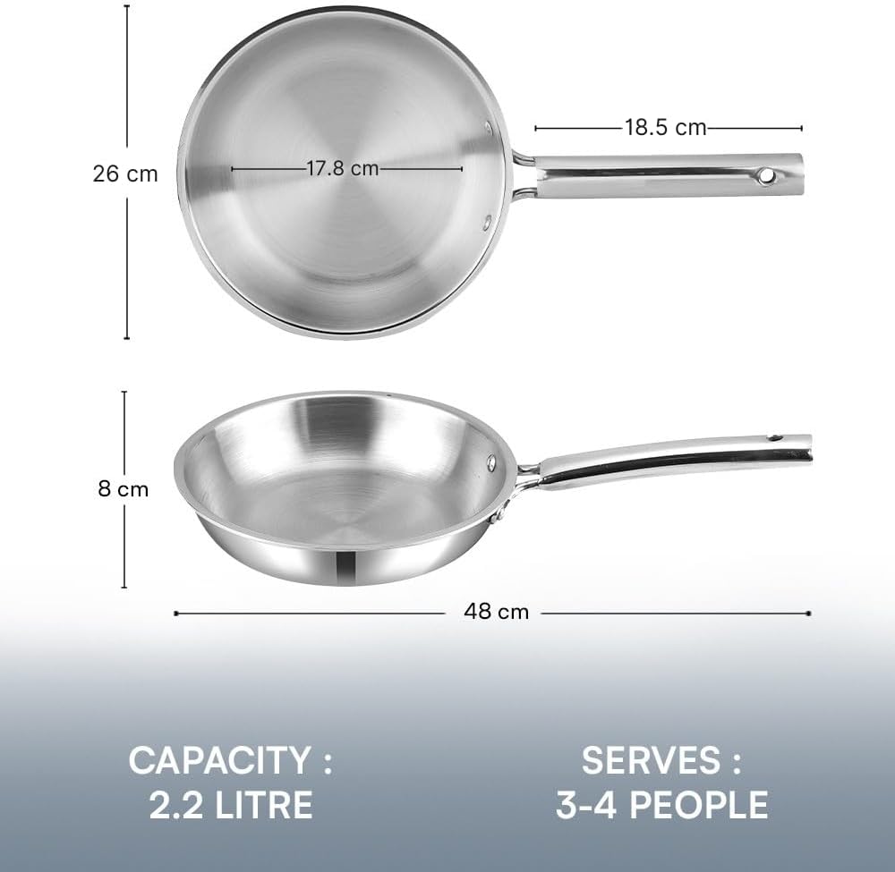 Product description Vinod triply stainless steel series is made up with Super Tough Triply material, which is a triple layer construction of stainless steel, aluminium and stainless steel. Safest cookware range made with premium food grade stainless steel .The inner layer is made up of food grade 18/8 stainless steel, which is hygienic stainless steel and rust free. The middle layer is consists of aluminium throughout, this ensures in even heat distribution and uniform cooking of food. The third layer is made of 430 stainless steel for induction compatibility. This triply stainless steel frypan comes with riveted stainless steel handle that is ergonomically designed, provides maximum durability and extreme comfort. It is compatible across all heating platforms like gas, induction, ceramic, infrared and hotplate. Make wholesome nutritious healthy dishes including stir fried vegetables, omelet, gravies, pancakes, fish fries and much more. This Saucepan requires less cooking oil. The food grade stainless steel is hygienic and useful for Faster cooking. It has 2.5 mm base thickness. Size : 24 cm Diameter. Ideal for 3-4 persons. It has 60 months manufacturer warranty. T&C apply. Manufacturer Contact Information Email ID : service@vinodcookware.com; Toll Free Number - 18002660456