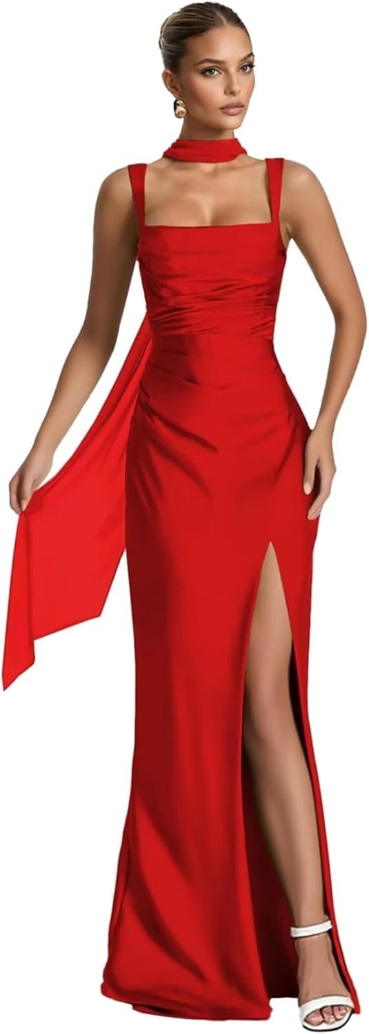Long Satin Bridesmaid Dresses for Women Mermaid Pleated Maxi Formal Evening Gown with Scarf