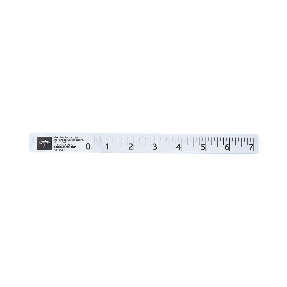 Flexible tape measure features inches on one side and centimeters on the other. Paper, disposable.
