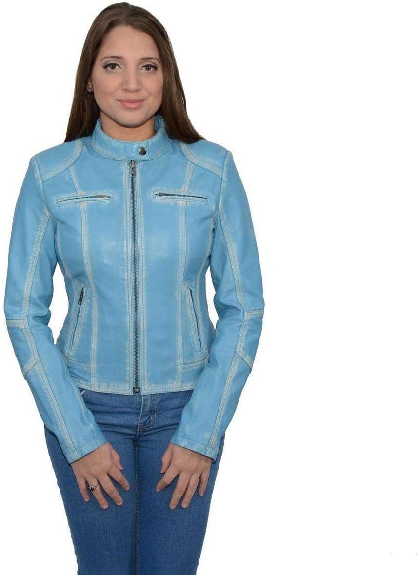 Milwaukee Leather SFL2830 Women's Aqua Scuba Style Sheepskin Fashion Leather Jacket Features Made of Premium Soft Touch Sheepskin Leather Front Zipper Closure with Snap Button Round Collar Rub Off Seams for Distressed Look 2 Front Chest Pockets with Zipper Closure 2 Hand Warmer Pockets Soft Inside Liner 2 Interior Drop Pockets Built Inside Hanging Loop Genuine YKK Zippers -Known for Longevity and Durability Milwaukee Leather - Once You Have It, You Love It!