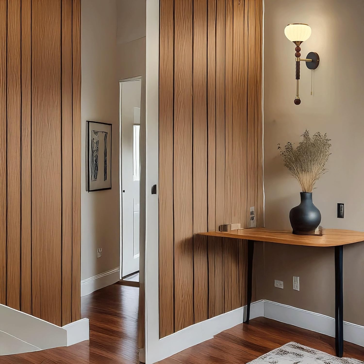 Product Parameters:Type: Wall Sconce / Wall LampStyle: Nordic, Modern, Minimalist, Decorative, Ambient Lighting, Contemporary, Elegant, Art Deco Inspired, Industrial Material: Metal (pole, accents - aluminum & hardware, brass tone finish), Rubber Wood (backplate, decorative parts - walnut wood color, textured), Glass (shade - frosted ribbed bell shape)Color: Brass Tone & Walnut Wood Color (metal & wood), Frosted White (shade)Dimensions:Width: 6.3" (16cm)Height: 22.8" (58cm)Projection from Wall: 8.7" (22cm)Socket Type: E27Number of Bulbs: 1Bulb Included: NoOptimized Special Feature: This Nordic style 1-light wall sconce features a sophisticated design with a dark walnut wood color rubber wood backplate and a textured central decorative wooden piece, contrasted by a sleek brass tone aluminum and hardware pole. A frosted ribbed bell-shaped shade diffuses the light gently. Designed to accommodate one E27 bulb (not included), it casts a soft, inviting illumination, creating an ambient and functional light source. Includes a convenient pull chain for operation. Its blend of natural wood, metal, and diffused light makes it a versatile and decorative light source, ideal for bedrooms, dining rooms, study rooms, or hallways, enhancing a contemporary, minimalist décor.Applicable Space: Ideal for Bedroom Bedside, Dining Room, Study Room, Hallway, Aisle, Living Room, Entryway, Office, Hotel, or other spaces desiring elegant decorative lighting.