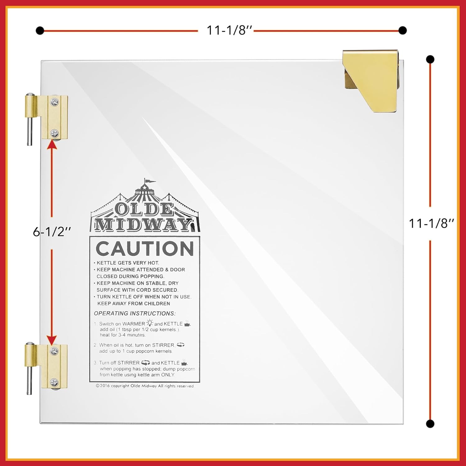 Upgrade your Olde Midway 10-ounce Popcorn Machine with our specially crafted replacement doors, designed to fit seamlessly Olde Midway popcorn machines. Engineered for compatibility, these glass replacement doors are made to fit Olde Midway 10-ounce movie theater-style popcorn machines should the original glass doors become damaged or broken. Update your Olde Midway Popcorn Machine with a fresh and polished appearance. These replacement doors add a touch of professionalism to your popcorn setup, enhancing the overall aesthetic appeal. Crafted with meticulous attention to detail, these replacement doors go beyond mere functionality, elevating the overall look of your Olde Midway popcorn machine. The sleek design and clear glass door panels create a polished and attractive appearance, making your popcorn machine a standout feature in any setting. Enhance the visual appeal of your popcorn station while ensuring the longevity and compatibility of your Olde Midway machine with these premium replacement doors. NOTE: Compatible with Olde Midway 10-ounce Movie Theater Popcorn Machines. Confirm machine model and design to ensure the correct door is ordered. Door Dimensions: 11-1/8" Side to Side x 11-1/8" High Care Instructions: Cleans easily with soap and water. Includes: Olde Midway Replacement Glass Door and Gold Hardware Olde Midway is well-known within the industry for finely crafted, specialty appliances that combine stylish design with exceptional durability at a great value.