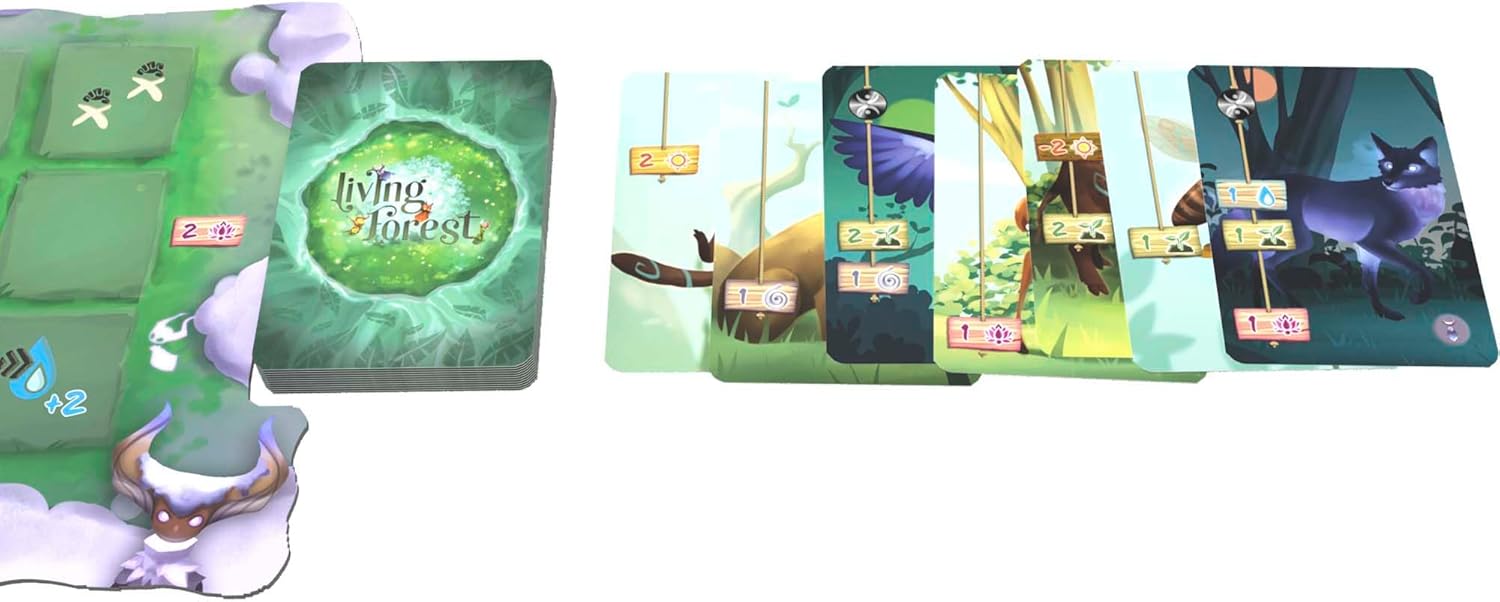 In Living Forest, you play as a nature spirit who will try to save the forest and its sacred tree from the flames of Onibi. But you are not alone in your mission as the animal guardians have come together to lend a hand around the Circle of Spirits where you progress. Each turn, they bring you valuable elements, so try to combine your team of animal guardians as best as possible to carry out your actions, but be careful because some are lonely and do not like to be mixed with others...
