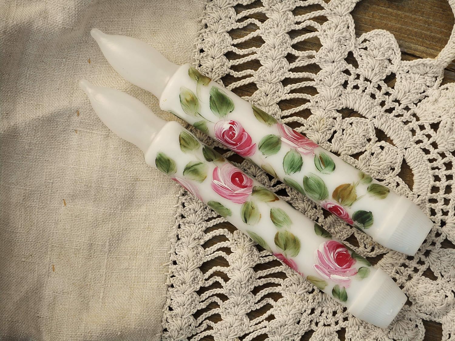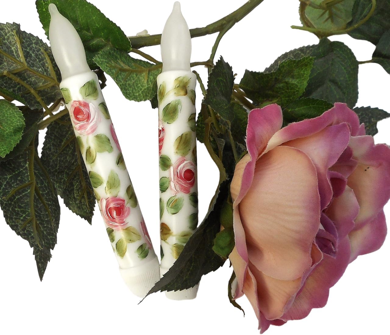 A charming set of 6" high flameless warm white taper candles, decorated with gorgeous hand-painted pink roses and golden-green leaves that will add romantic charm to any setting! Set them out anywhere to add a warm, softly-flickering glow, without the worries of real-flame candles....and they can be used again and again, unlike traditional candles! Their real wax coating gives them a realistic look! Just add "AA" batteries and with a twist of their bottoms, each taper will bathe the room with soothing light! What a charming addition to your decor or they make a unique gift for a fellow Romantic! Set of Two Plastic Flameless Ivory Taper Candles, 6 1/2" high, 3/4" wide (each set requires 4 "AA" batteries...batteries not included)
