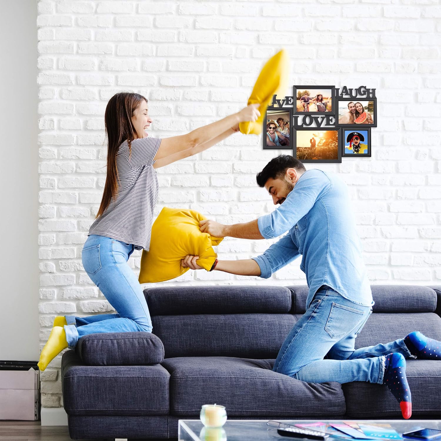 Product Description Do you find that all those pictures of precious moments with family and friends are rotting away on your computer or in some drawer? With this large gallery frame you can share these treasures with curious visitors! Create your own personal photo collage by using the highly decorative gallery frame! It can accommodate a total of 5 photos, drawings or postcards. The curved individual frames enhance the 3D-look of this hanging collage and thus make the whole item a decorative eye-catcher in and of itself. Photo Frame for 5 Pictures Details • Total size: H x W x D: app. 31 x 45.5 x 2 cm • Distance between brackets : app. 23-26 cm • Material: Plastic, cardboard • Weight: approx. 500 g • With lettering: Live Love Laugh Hanging Gallery Photo Frame • For 5 photos or images • 1 Photo size 10 x 10 cm • 3 Photos size 10 x 15 cm • 1 Photo size 18 x 13 cm • Available in black or white Photo Collage for 5 Photos • Connected frames with a 3D-look • Re-decorate again and again • For portraits, family and vacation photos, etc. • Revives old memories • Customize and give it away Included in Delivery • 1 x Picture Frame • Decorative items shown in product photos are not included Set Contains: 1 x Multi Picture Frame