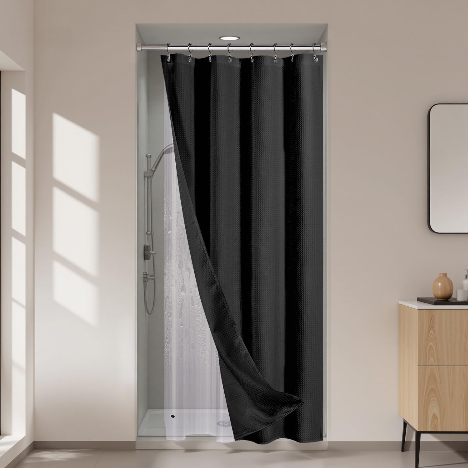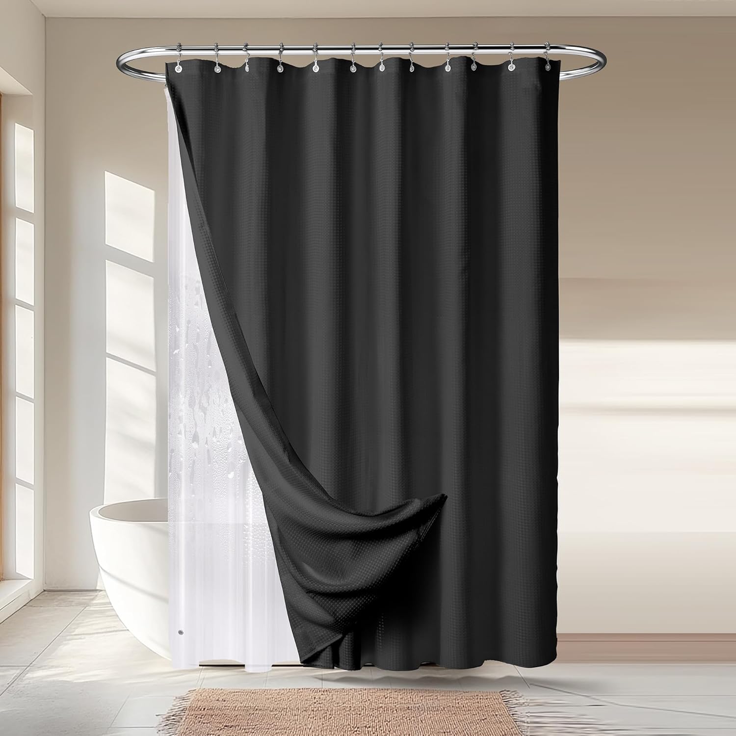 • Complete 3-in-1 Bathroom Set: This shower curtain set includes a luxurious waffle-textured shower curtain, a clear PEVA shower liner, and 12 double-sided metal hooks, offering a all-in-one solution