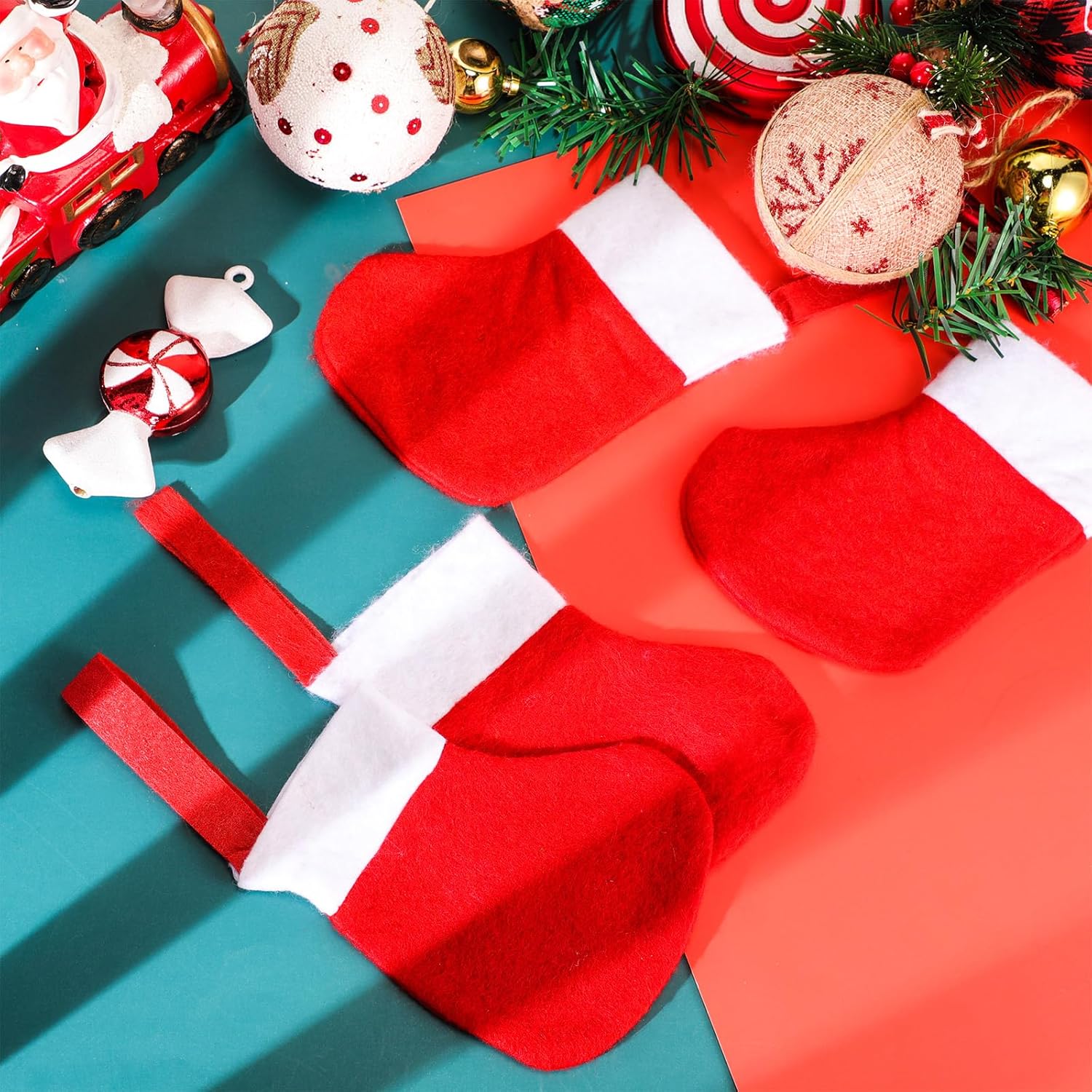 Features: Thoughtful gifts: Christmas stocking gifts make thoughtful gifts to present to your friends, family, coworkers, and even students. With its charm, practicality, and classic Christmas appeal, people of most ages will appreciate and enjoy. Multiple usages: Rustic stockings Christmas serve multiple uses in your holiday setup. They serve as gift pouches for little treats and presents, candy or gift cardholders for party favors, or DIY material for your creative holiday crafts. Specifications: Material: non woven fabric Color: red, white Size: about 3.2 x 5.9 inches/ 8 x 15 cm Package includes: 200 x Mini Christmas stockings Notes: Manual measurement, please allow slight errors on size. The color may exist a slight difference due to different screen displays.