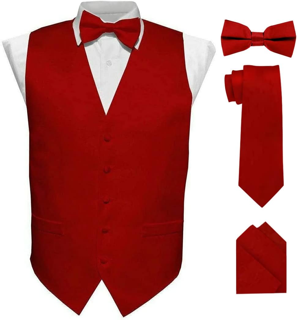 VITTORIO FARINA Men's Classic Solid Satin Casual (Black Back) Business Suit Vest, Lightweight Full Cut Waistcoat Set of 4 - Vest, Tie, Bow Tie & Pocket Square