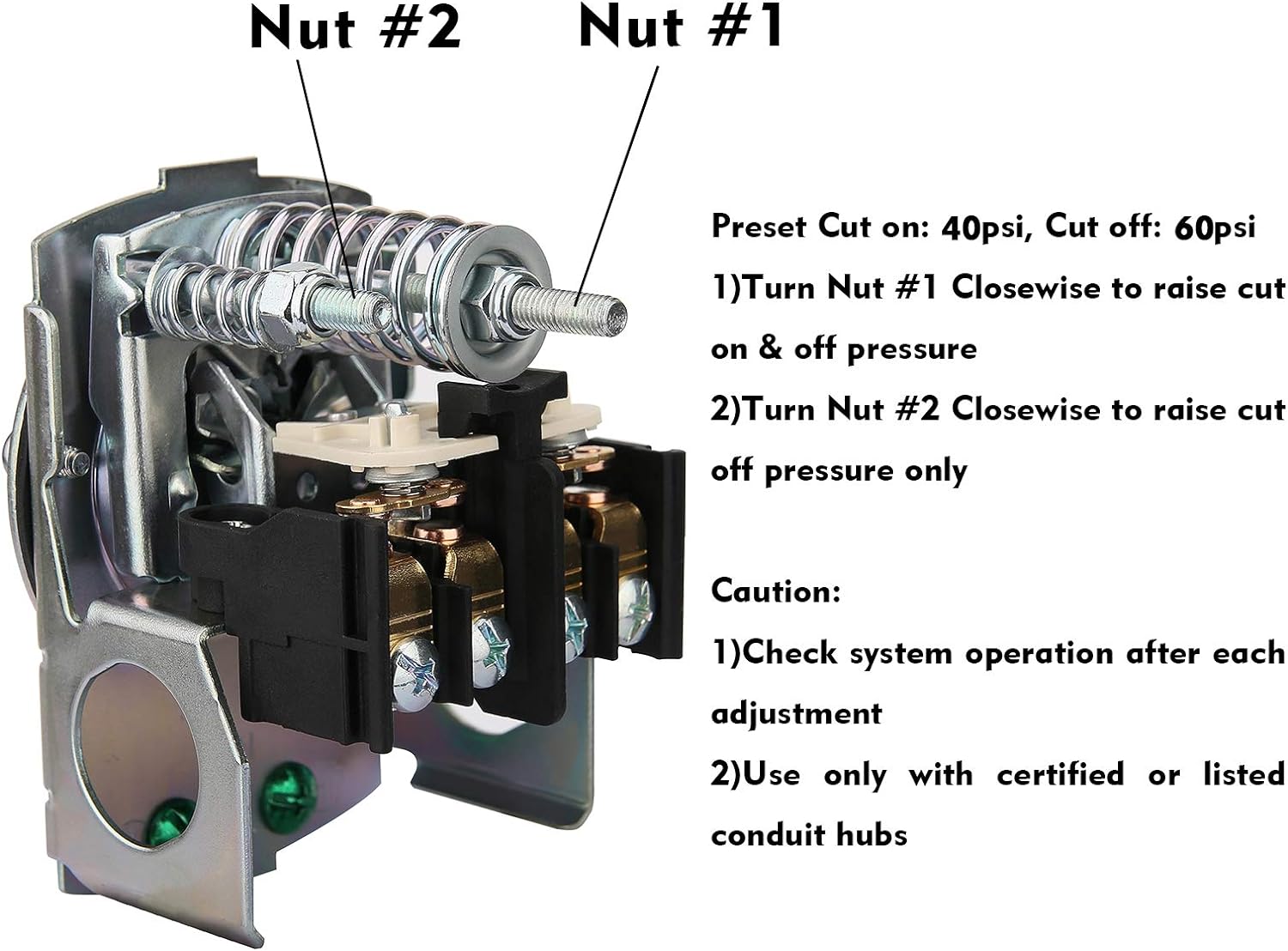 Description The Air-Pump Pressure Switch works with a 1.5 hp or less pump. Pressure switch with 40-60 psi pressure setting range, adjustable differential range of 15-30 psi, cut-out range of 20-65 psi. Connection is 1/4"NPT Female. Easy install, a switch cover label (inside the cover) provides setting instructions exactly when you need them.