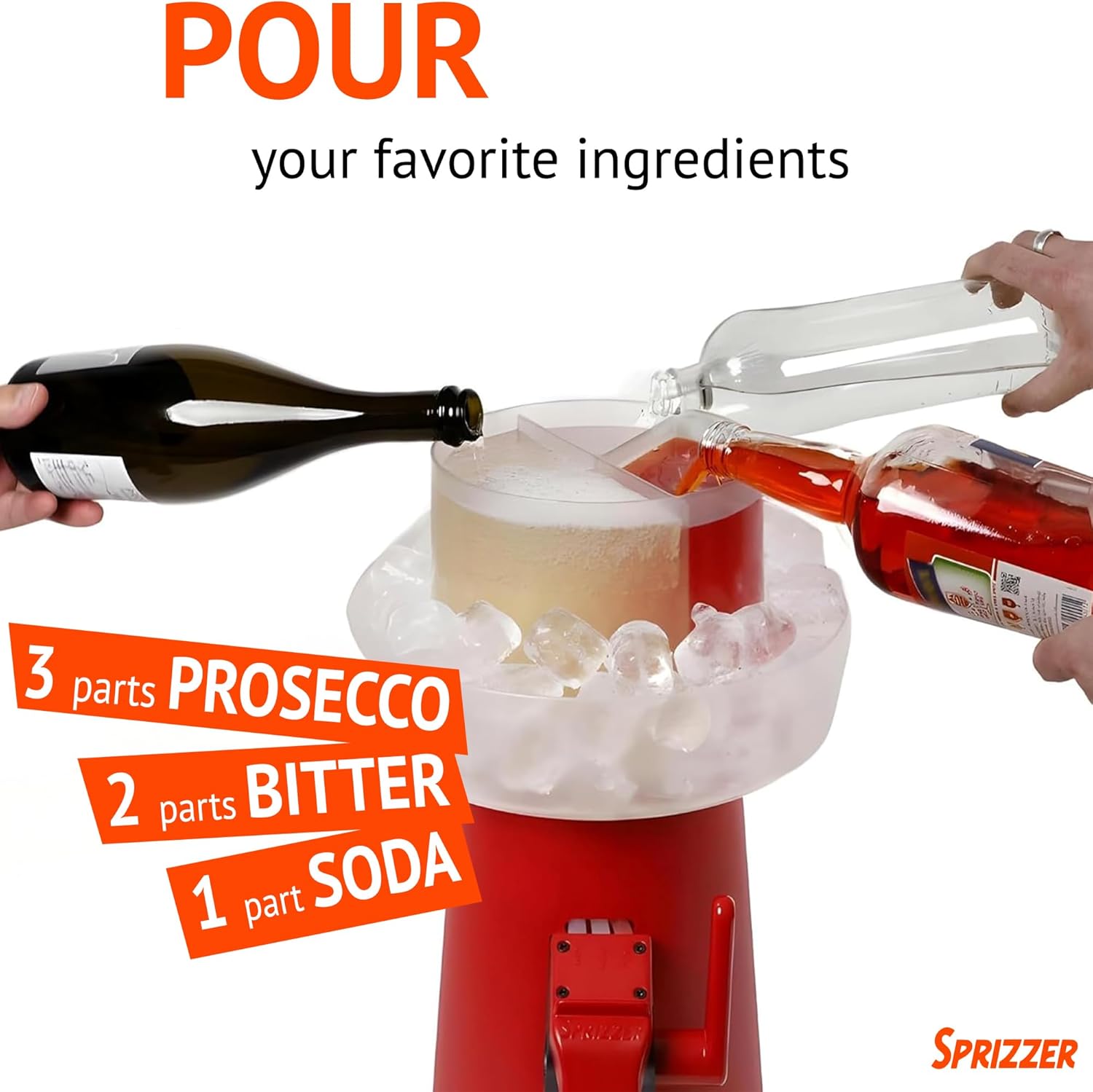 This new and innovative machine prepares the perfect Spritz straight into your glass. The three tanks keep the ingredients separate until the last moment: lower the lever and they will drop in the right amount straight into your glass, to mix and create the perfect Spritz. A 100% Made in Italy product: enjoy the iconic aperitif moment with the people you love. Leave it self service so everyone can have fun and you too can stay in the center of the party instead of staying all the time with the bottles in hand. A surprising product that, over dozens of glasses always the same, is a multiplier of celebration and conviviality. The official recipe: Sprizzer dose 3 parts Prosecco, 2 parts Aperol/Campari/Select and one part Seltz/Carbonated Water. An irresistible taste and always perfect.