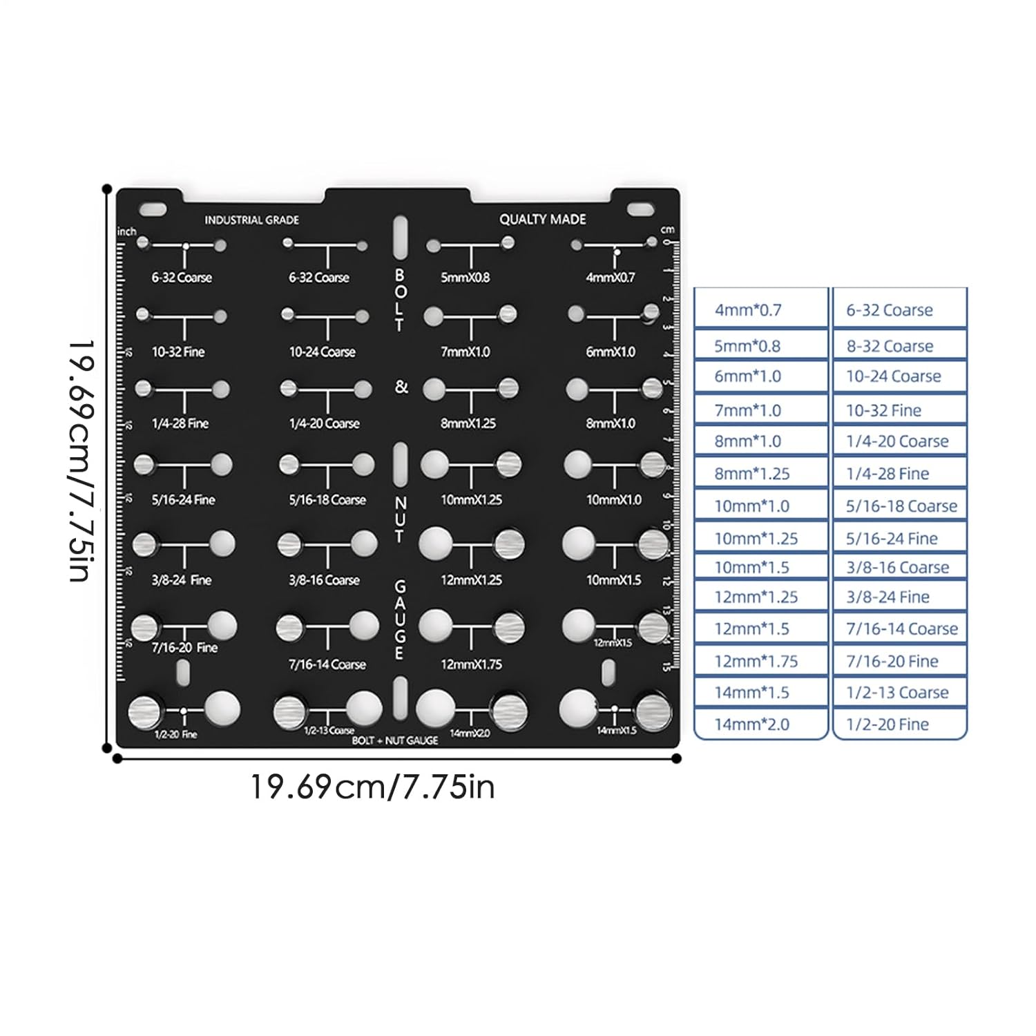 Clear and accurate with metric and imperial units, it is a must for mechanics and enthusiasts. Product Name: Nut/Bolt Thread Tester Product material: aluminium alloy. Product size: 198 x 198 mm/7.79 x 7.79 inches. Product Weight: 810g PRODUCT SPECIFICATIONS: Metric - 4mm x 0.7, 5mm x 0.8, 6mm x 1.0, 7mm x 1.0, 8mm x 1.0, 8mm x 1.0, 8mm x 1.25, 10mm x 1.0, 10mm x 1.25 , 10mm x 1.5, 12mm x 1.25, 12mm x 1.5, 12mm x 1.75, 14mm x 1.5, 14mm x 2.0 Inch: 6-32 Coarse, 8-32 Coarse, 10-24 Coarse, 10-32 Fine, 1/4-20 Coarse, 1/4-28 Fine, 5/16-18 Coarse, 5/16-24 Fine, 3/8-16 Coarse, 3/8-24 Fine, 7/16-14 Thick, 7/16-20 Fine, 1/2-13 Coarse, 1/2-20 Fine Product List: Nut & Bolt Thread Tester x 1pc